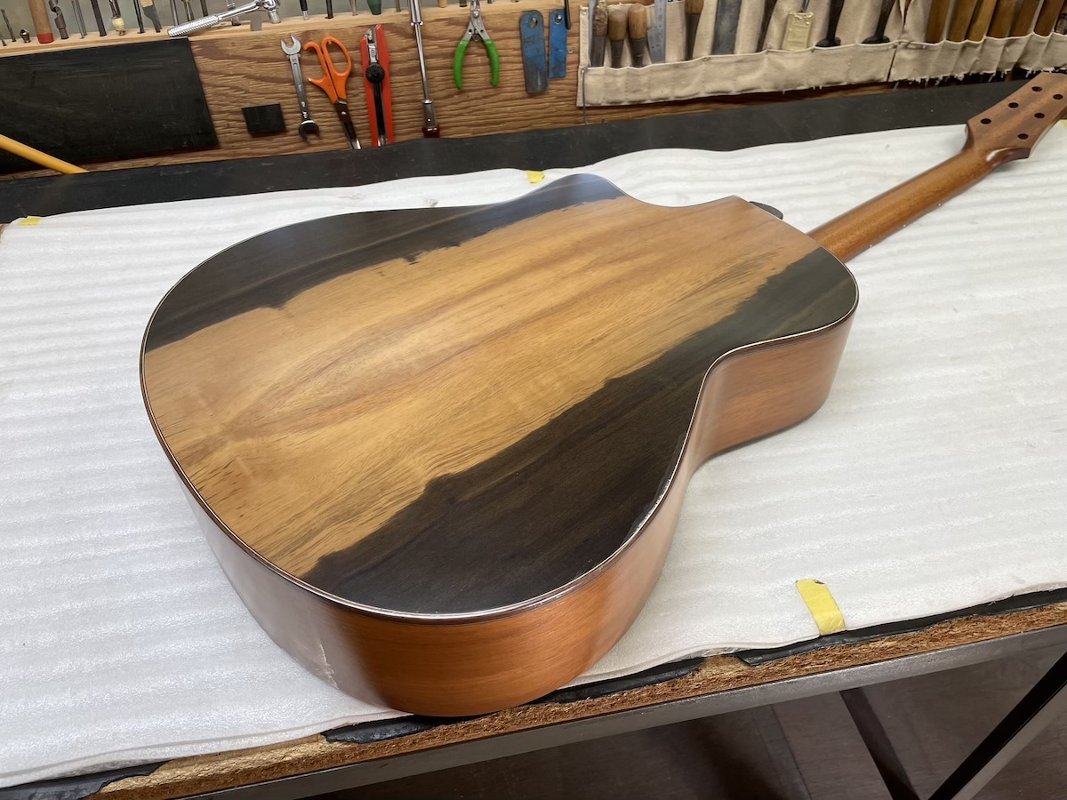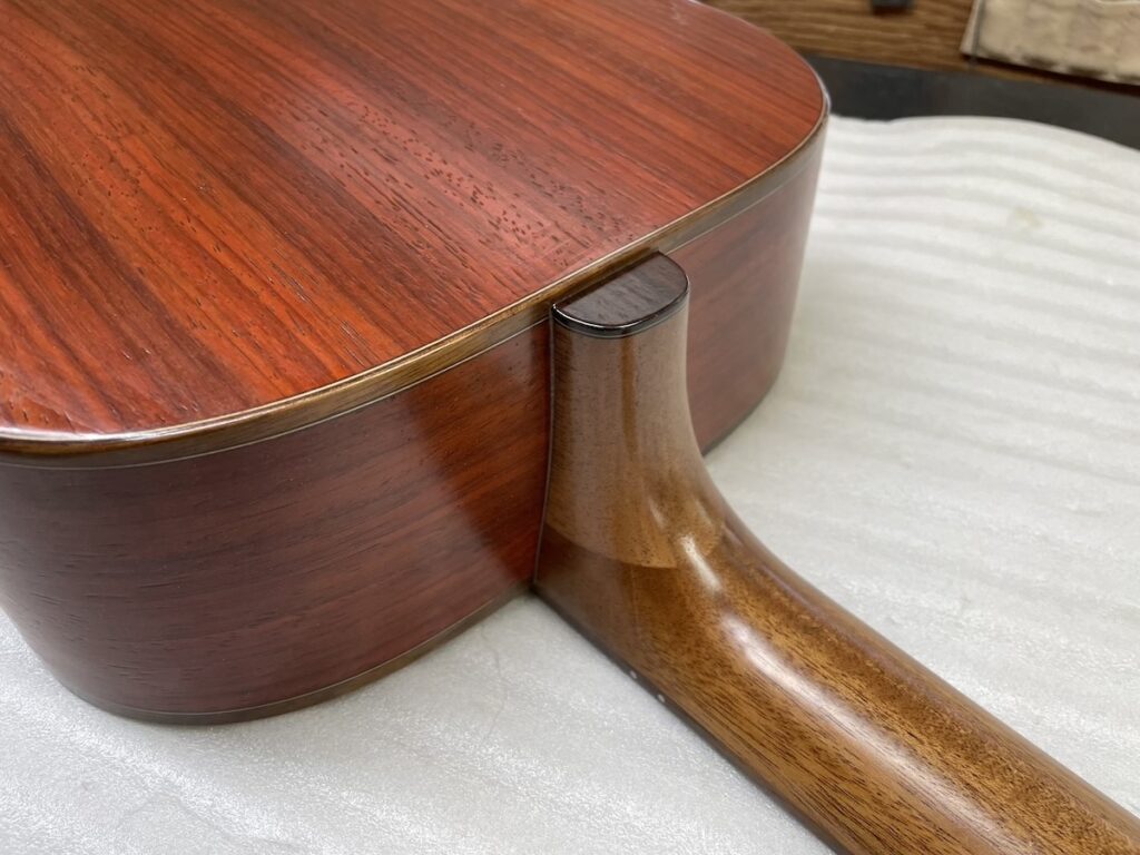 バック材にエキゾチックエボニー、サイド材にホンジュラスマホガニーと、いずれも貴重な材料を合わせたモデルです。