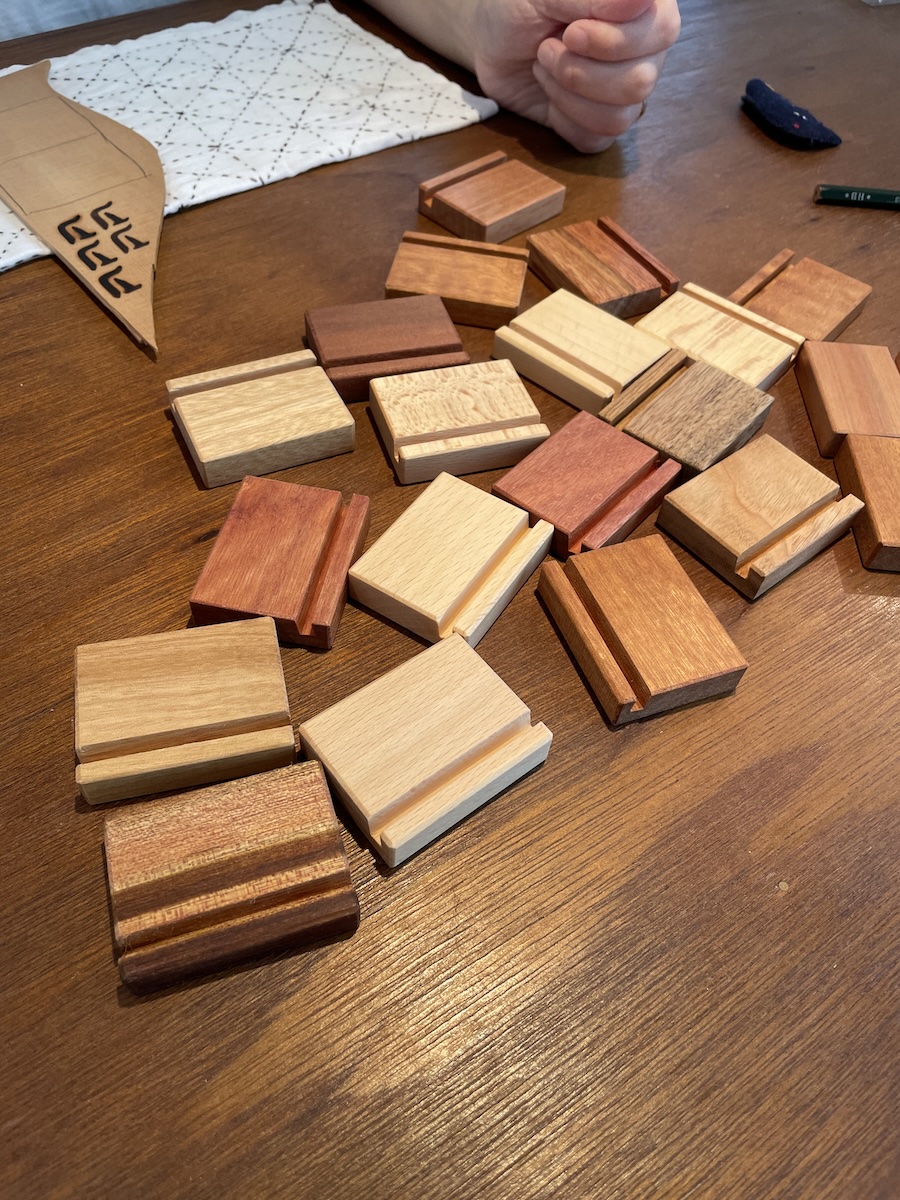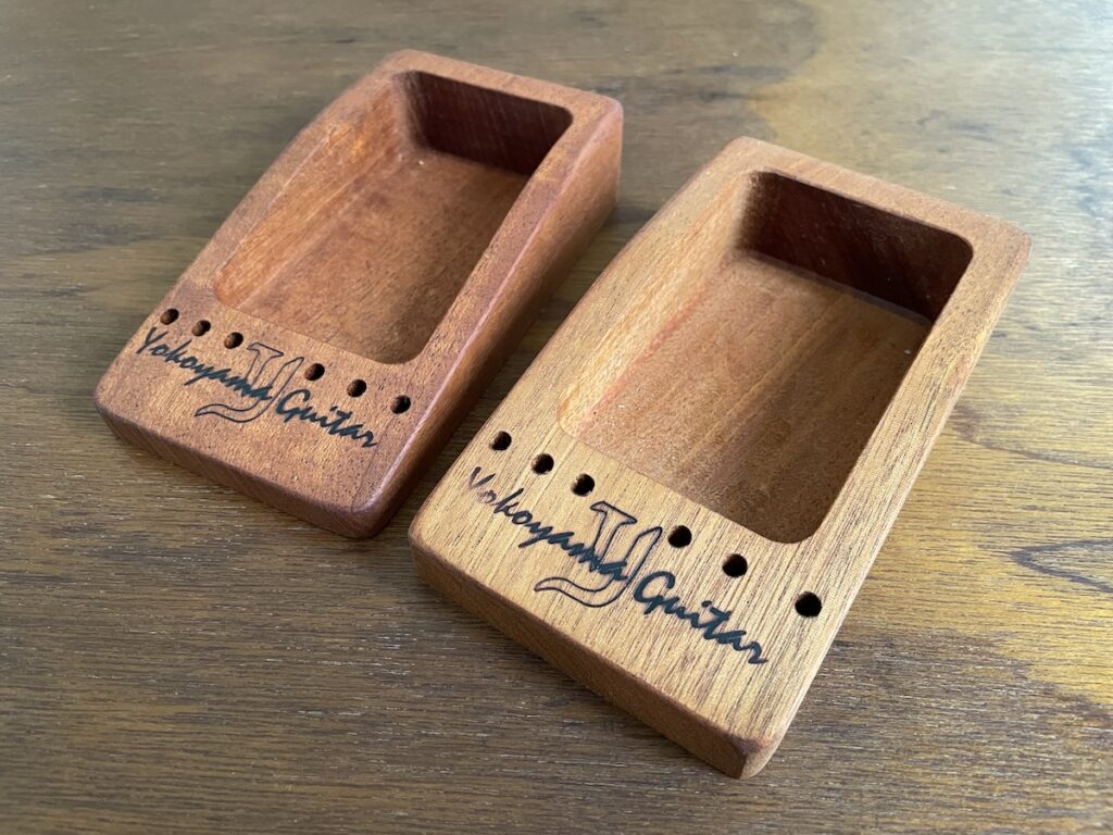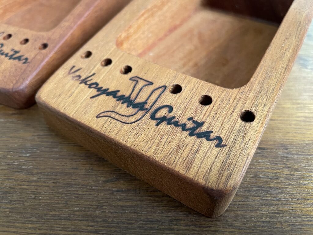 新品ギターをご購入 or オーダーいただいたお客様には、プラスして、特製小物入れもプレゼントさせていただきます。小物入れの手前の6つの穴は、弦交換の際のブリッジピン立てとしてお使いいただけます。