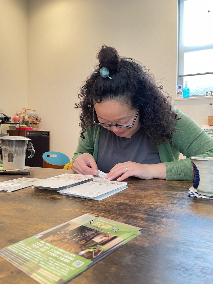 ユーザー様へ送付させていただいた、イベントご案内状の製作風景もちらりとお見せします。完成したハガキに、一枚一枚ラベルシールの貼り付けです。