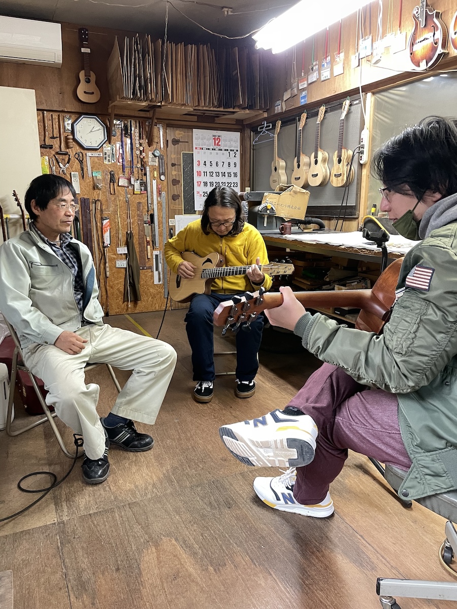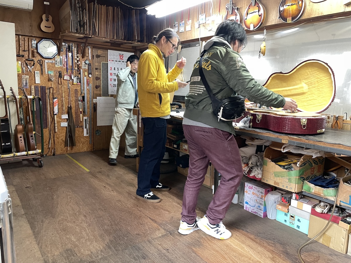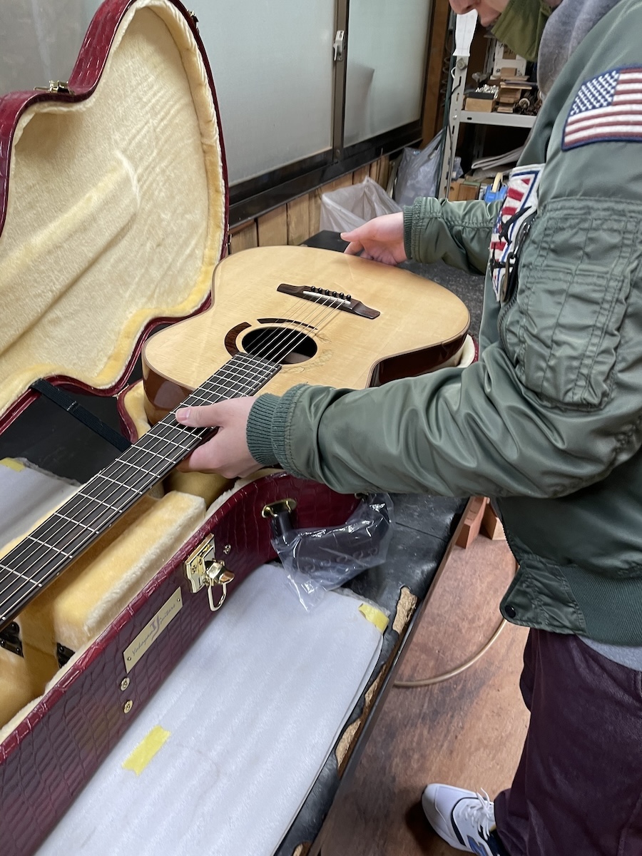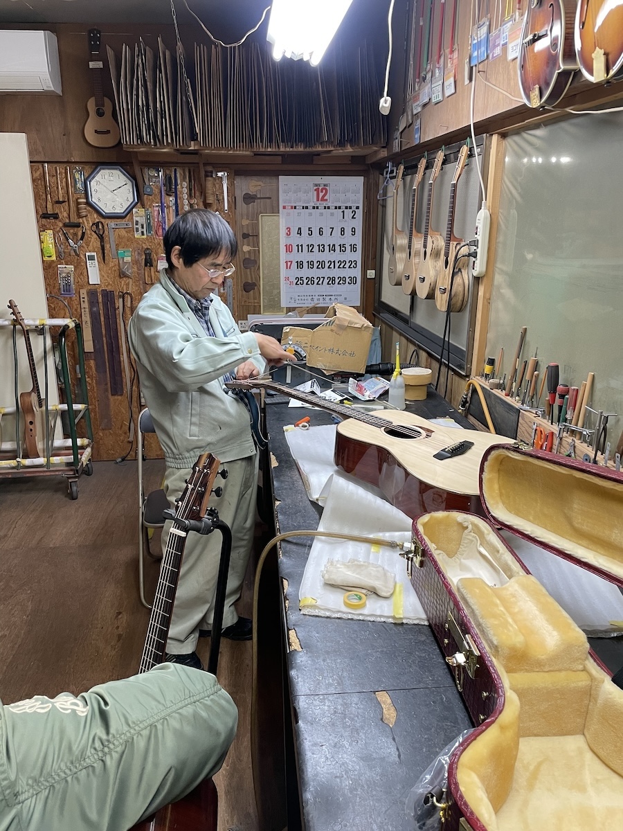 工房に戻り、A様のリクエストにあわせて微調整。新しい材料や、その他のギターも入念にチェックしていただきました。