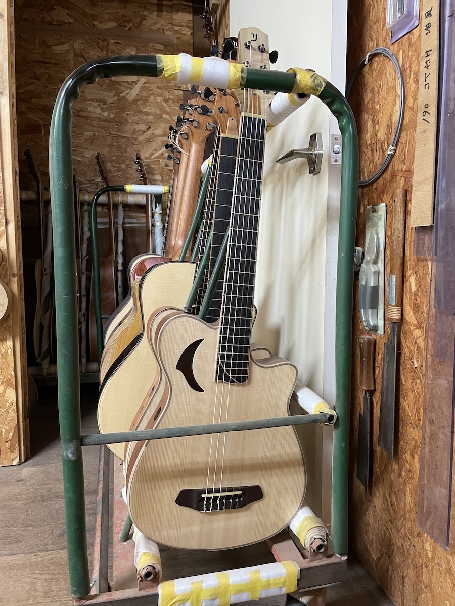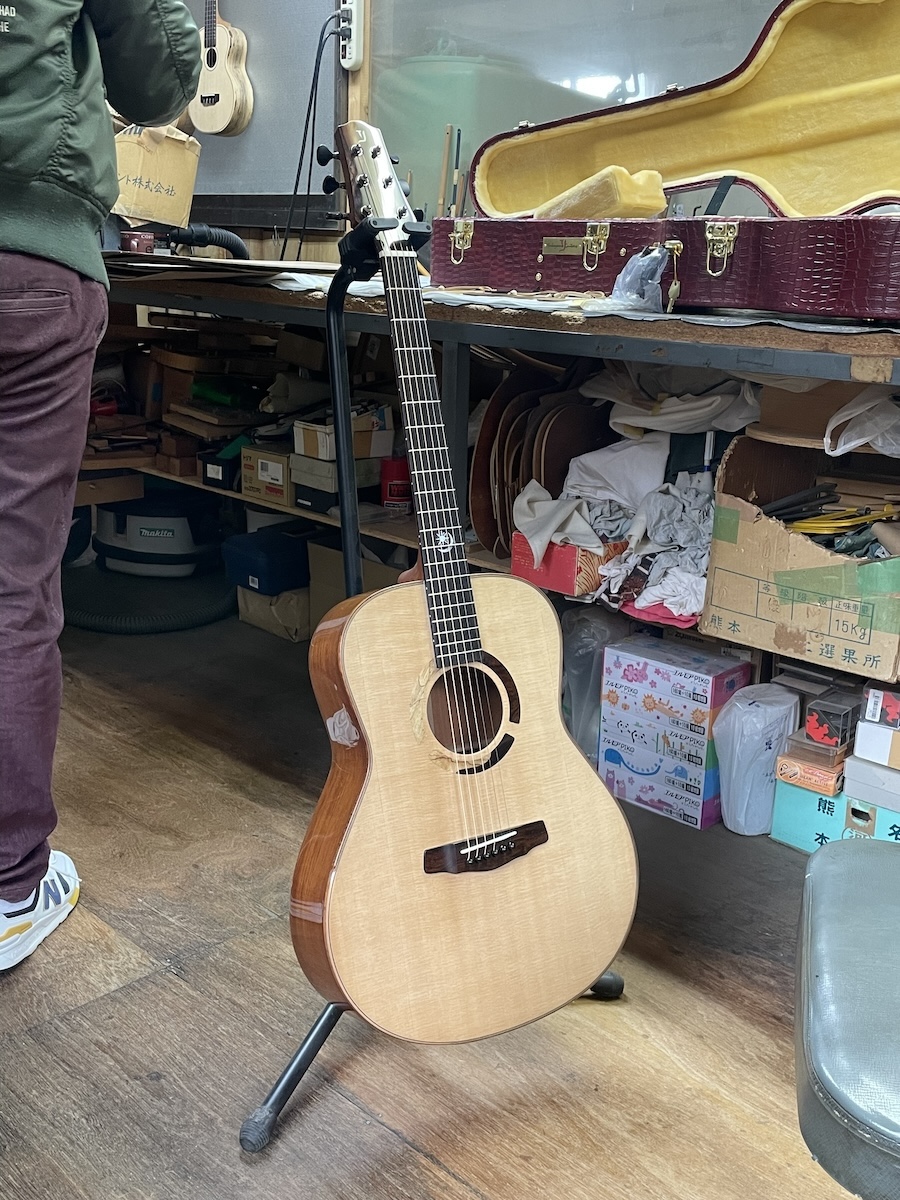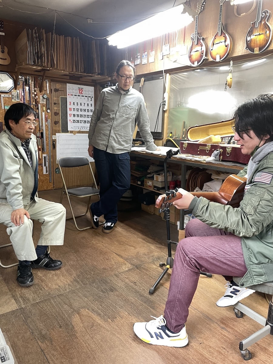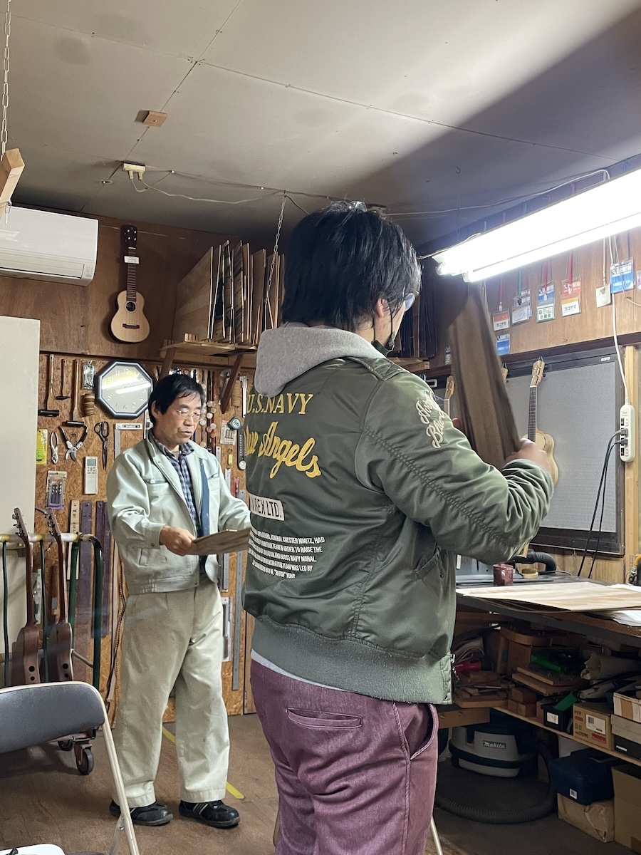 工房に戻り、A様のリクエストにあわせて微調整。新しい材料や、その他のギターも入念にチェックしていただきました。