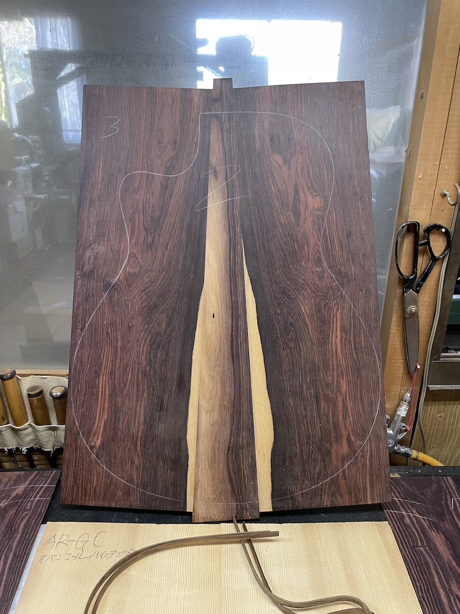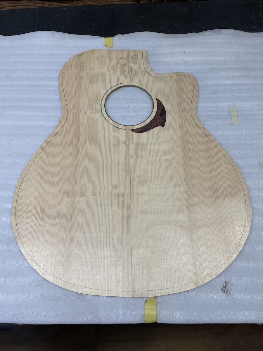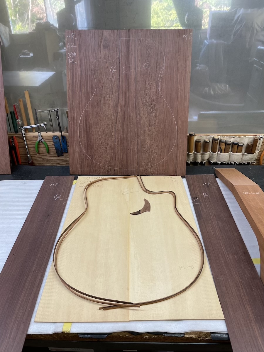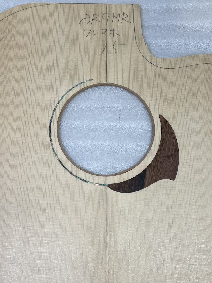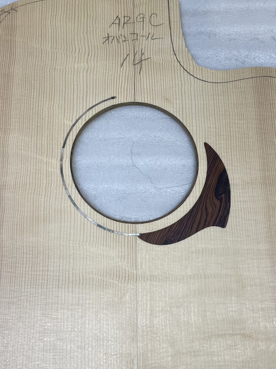 こちらは、ジャーマンスプルーストップに、マダガスカルローズウッドバック&サイドを採用したARシェイプモデルです。サウンドホールインナー等も採用し、おしゃれな仕上がりになりそうです。