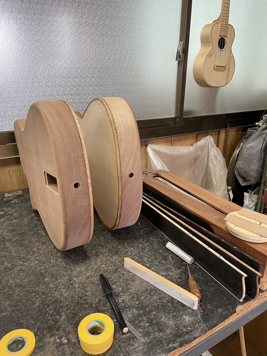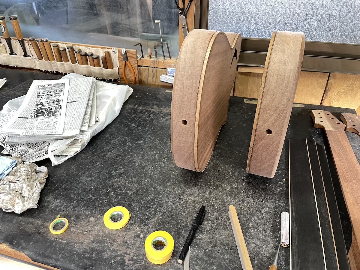 橋川さんとはここで別れて、工房にて引き続き製作活動です。先ほどの製作中モデルや、お客様をお待たせしているギターもありますので、いつものリズムで製作を進めていきます。