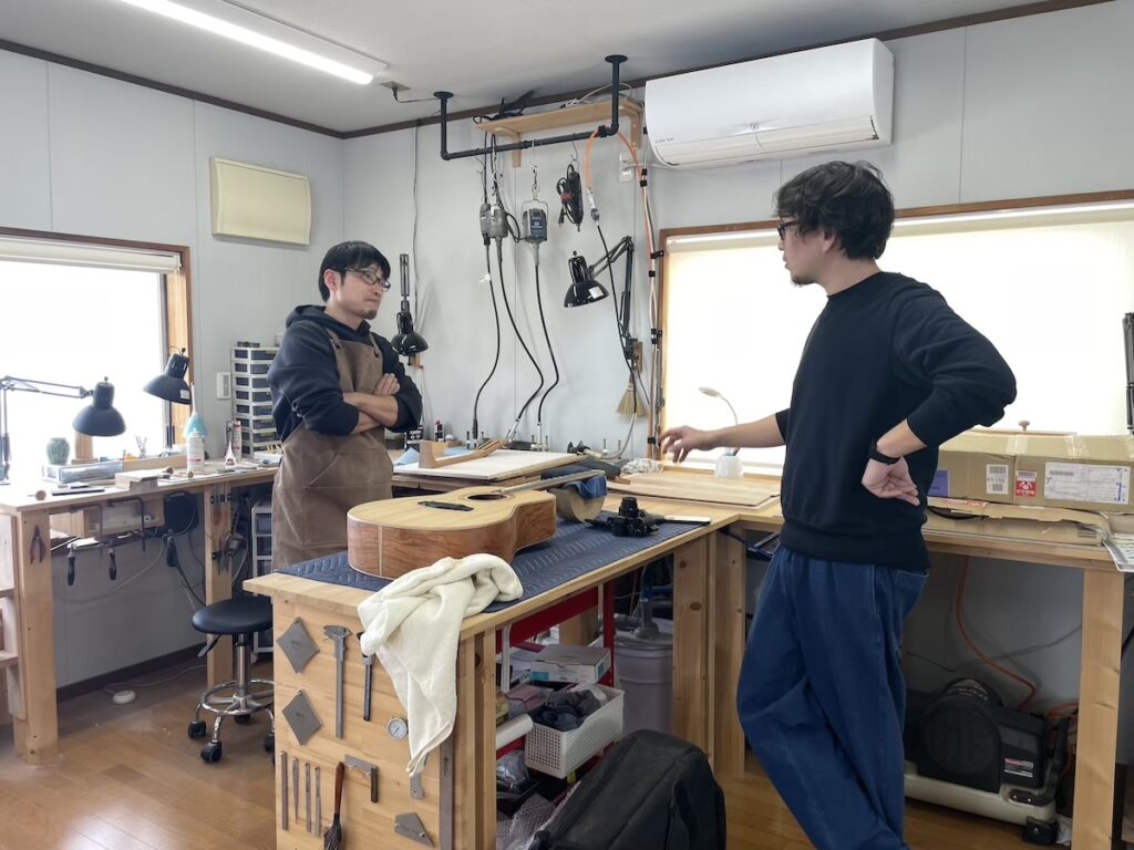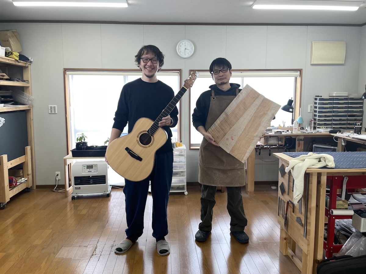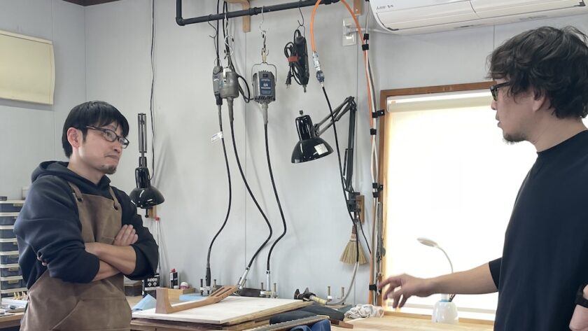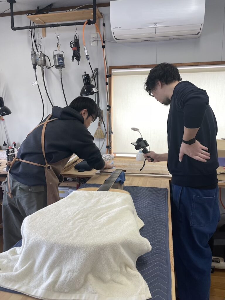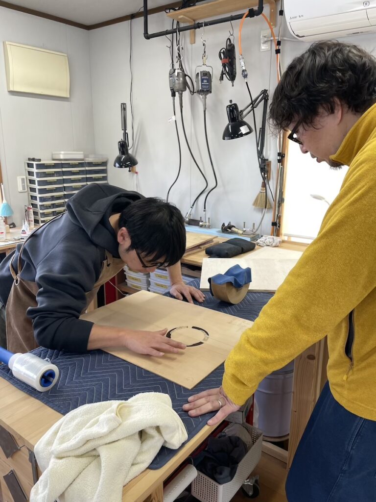 工房へ材料を持ち込み、確認してもらいます。インレイのイメージを伝えて、あとは小川さんのセンスにお任せです。