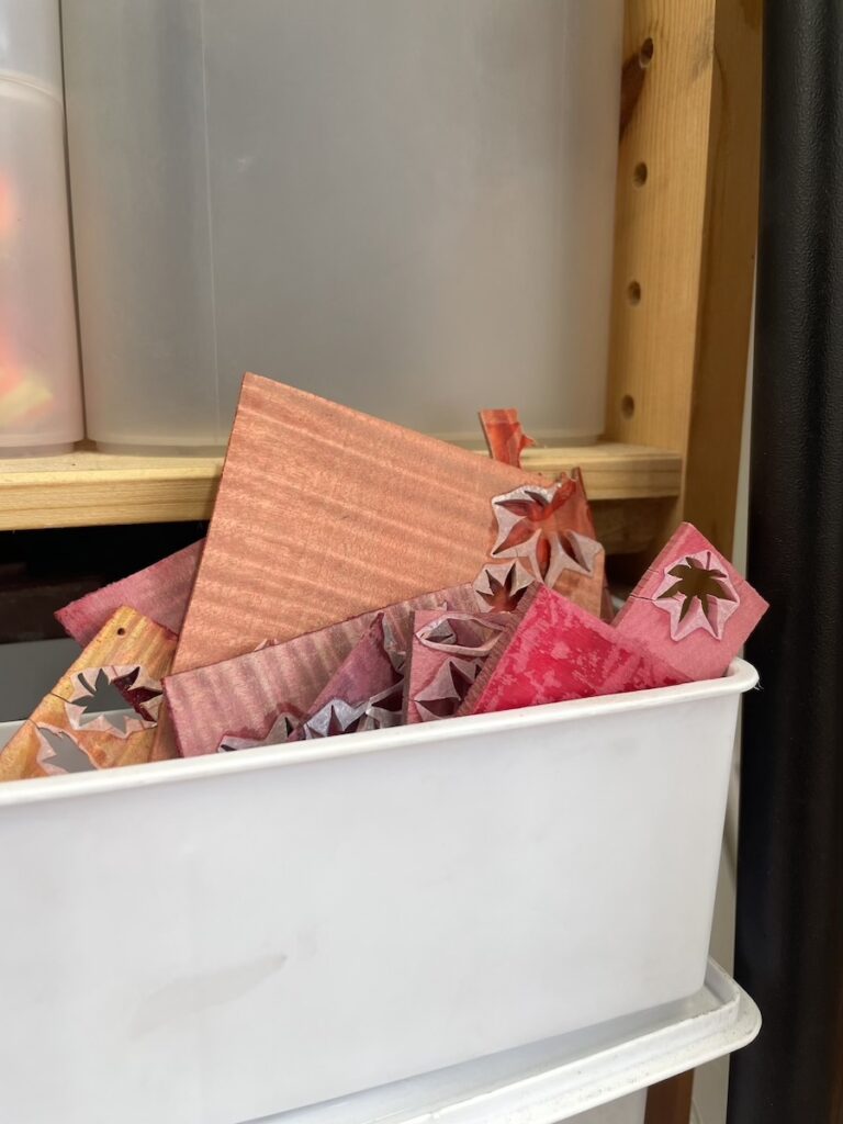 「もみぢ」モデルのインレイ材を抜き出した端材が、工房の一角に…。きれいな色味ですね。