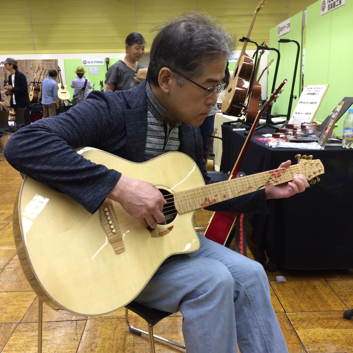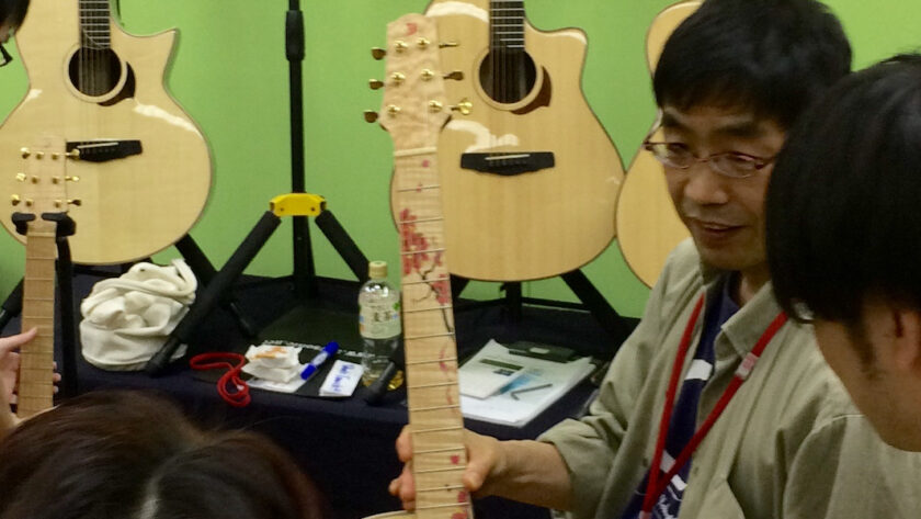 メイプル指板、ブリッジを採用した白いキャンバスに、「OGAWA INLAY CRAFT」に長野の風景をイメージしたインレイを入れていただきました。これがもう、もの凄いインパクト。