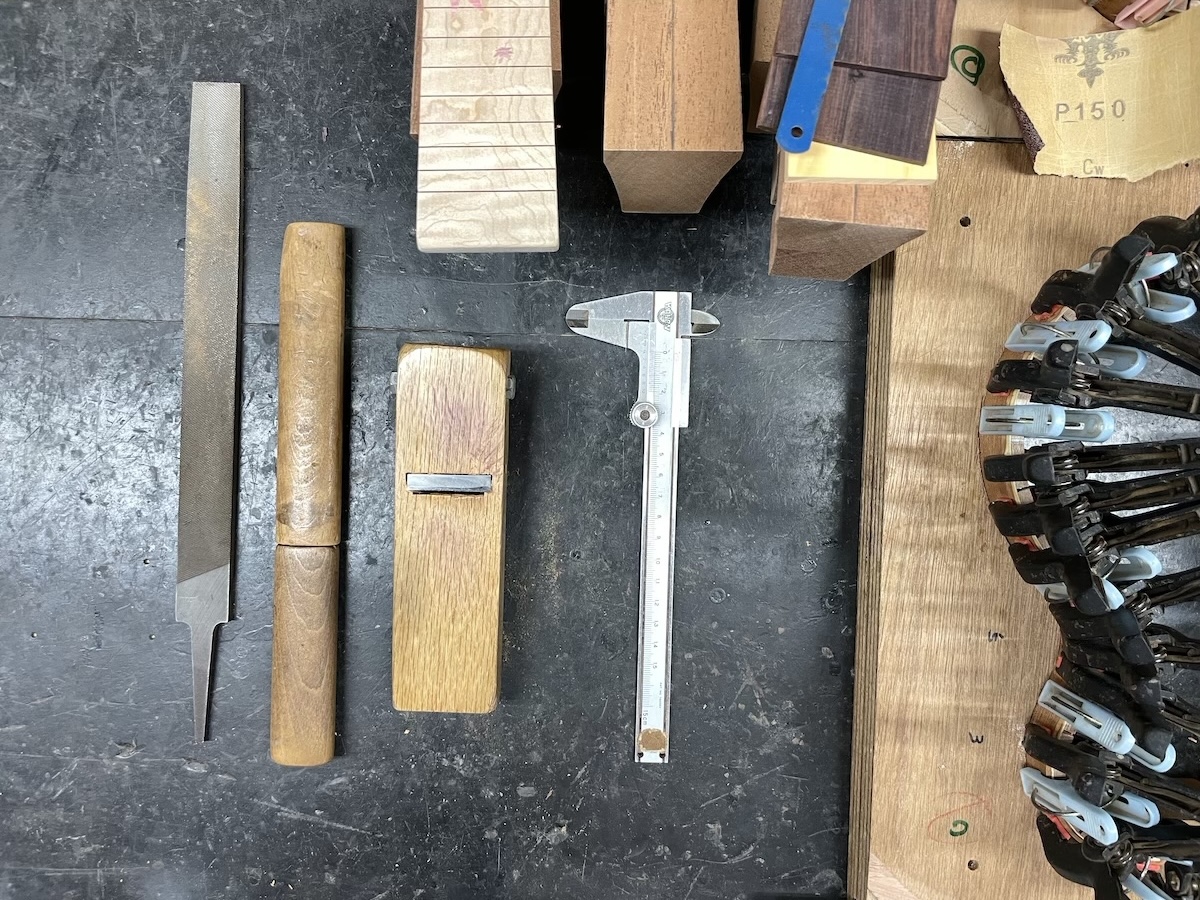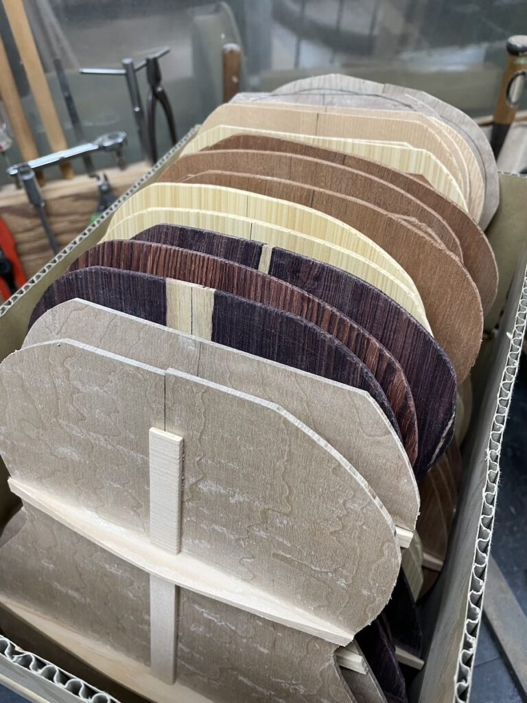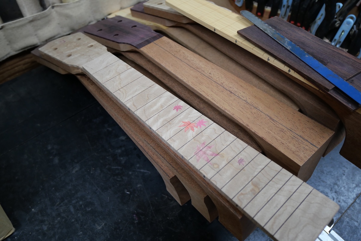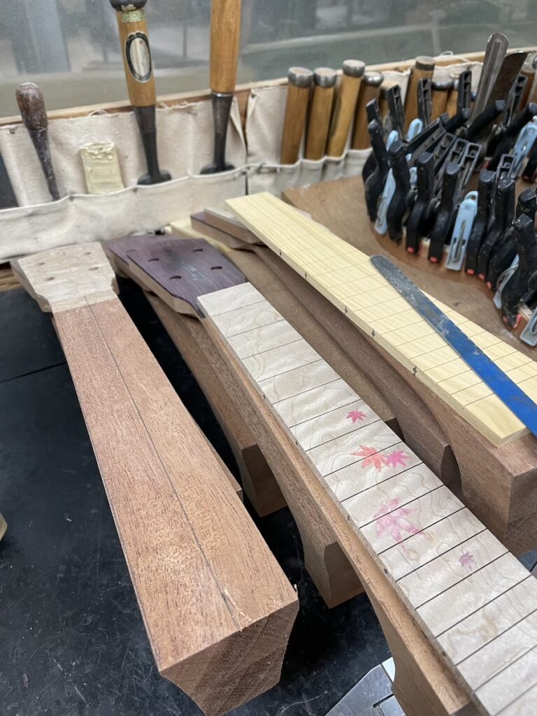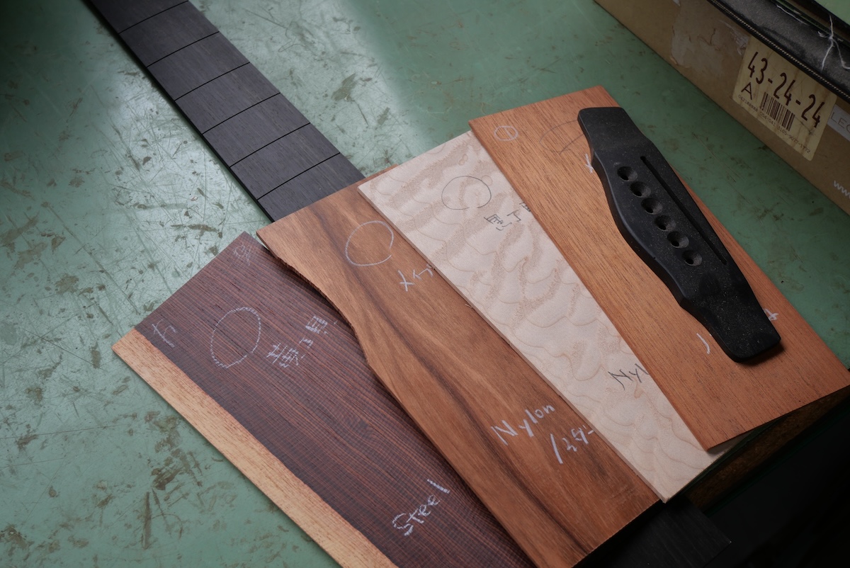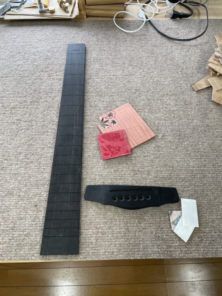 先日オーダー内容が決定したN様の指板&駒材と、このあと製作を進めるモデルのヘッド天神材です。ハンドキャリーしてもらえれば、材料の割れなど心配いらないので、とても安心です。