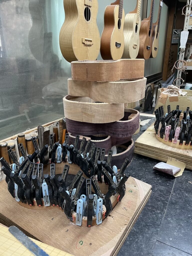 ネック材以外は「もみぢ」を採用した、オール「もみぢ」のコンサートウクレレ。今回ショーモデルと製作しているギターと、対になるウクレレとなりそうです。