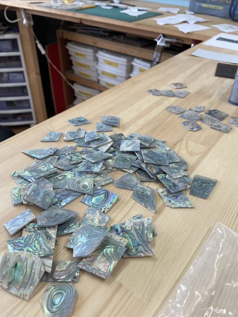 お客様オーダー品の進捗画像等を撮影し、この日は小川さんの工房に、インレイ加工をしてもらう材料をTOKYO OFFICE組に移動してもらいます。