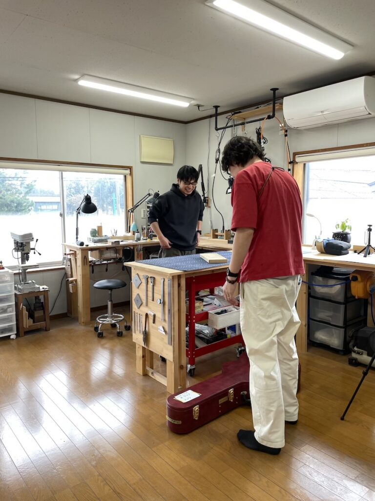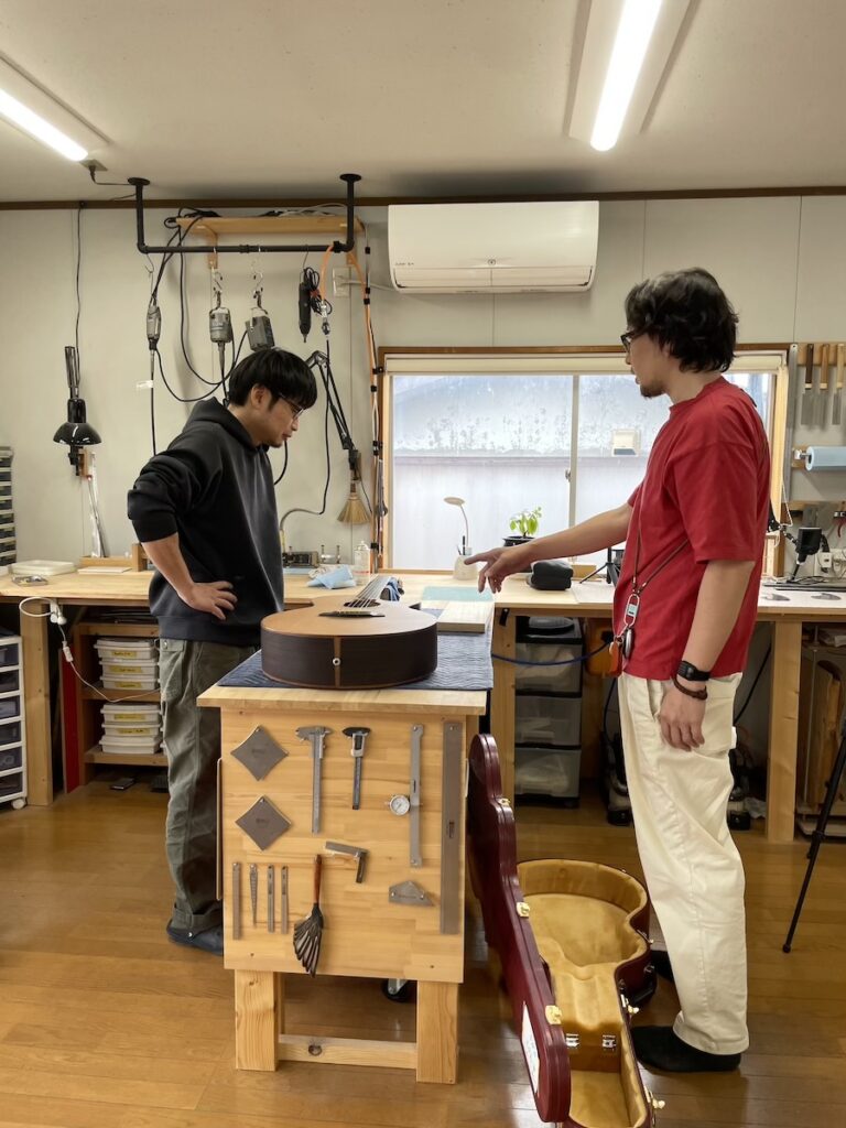 作業をお願いするギターを預けつつ、リクエストをしながらインレイイメージを膨らませてもらいます。