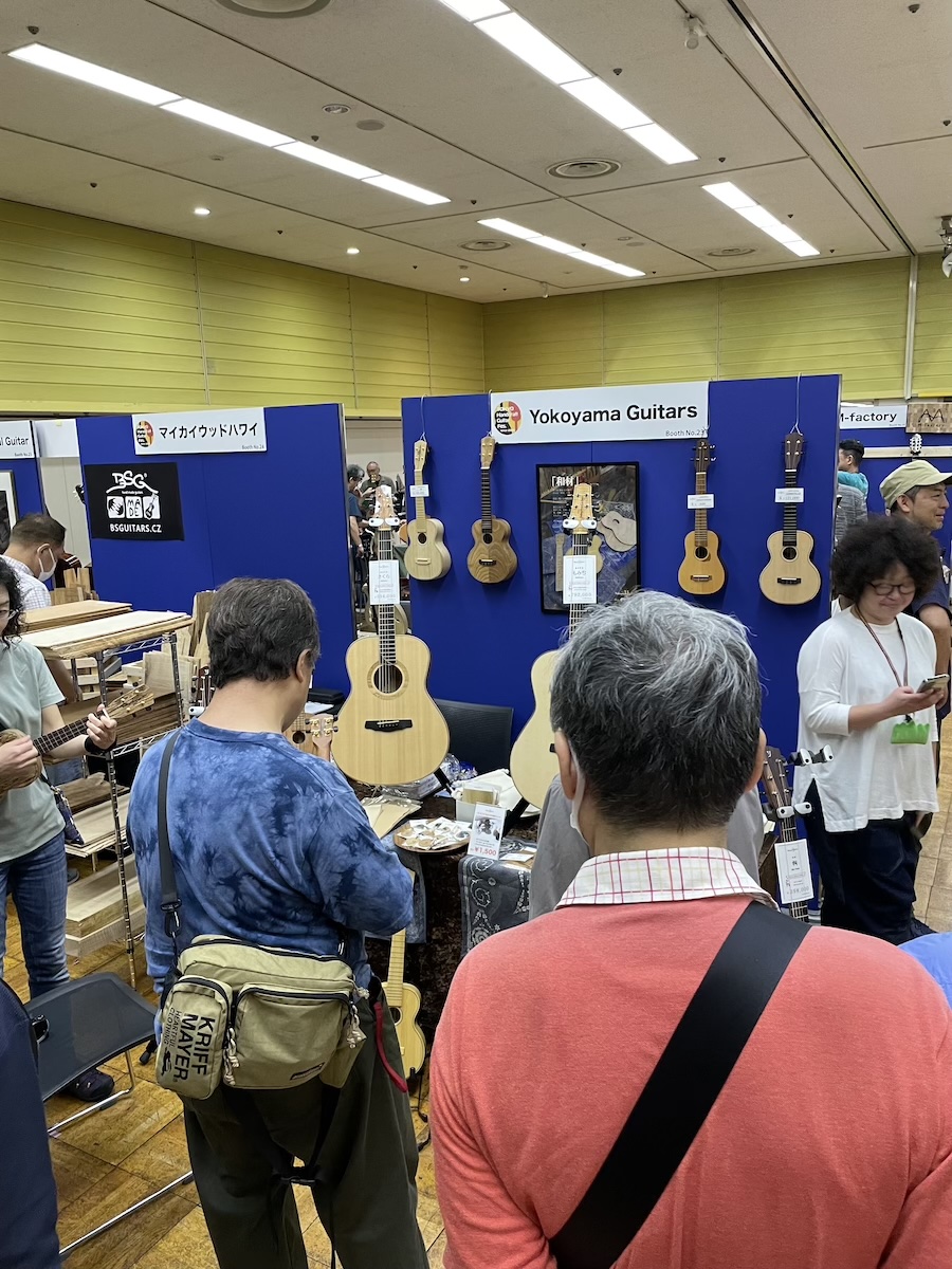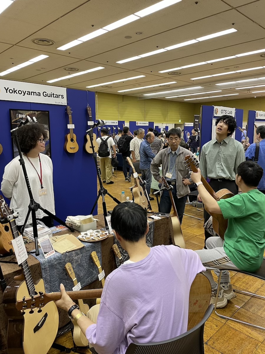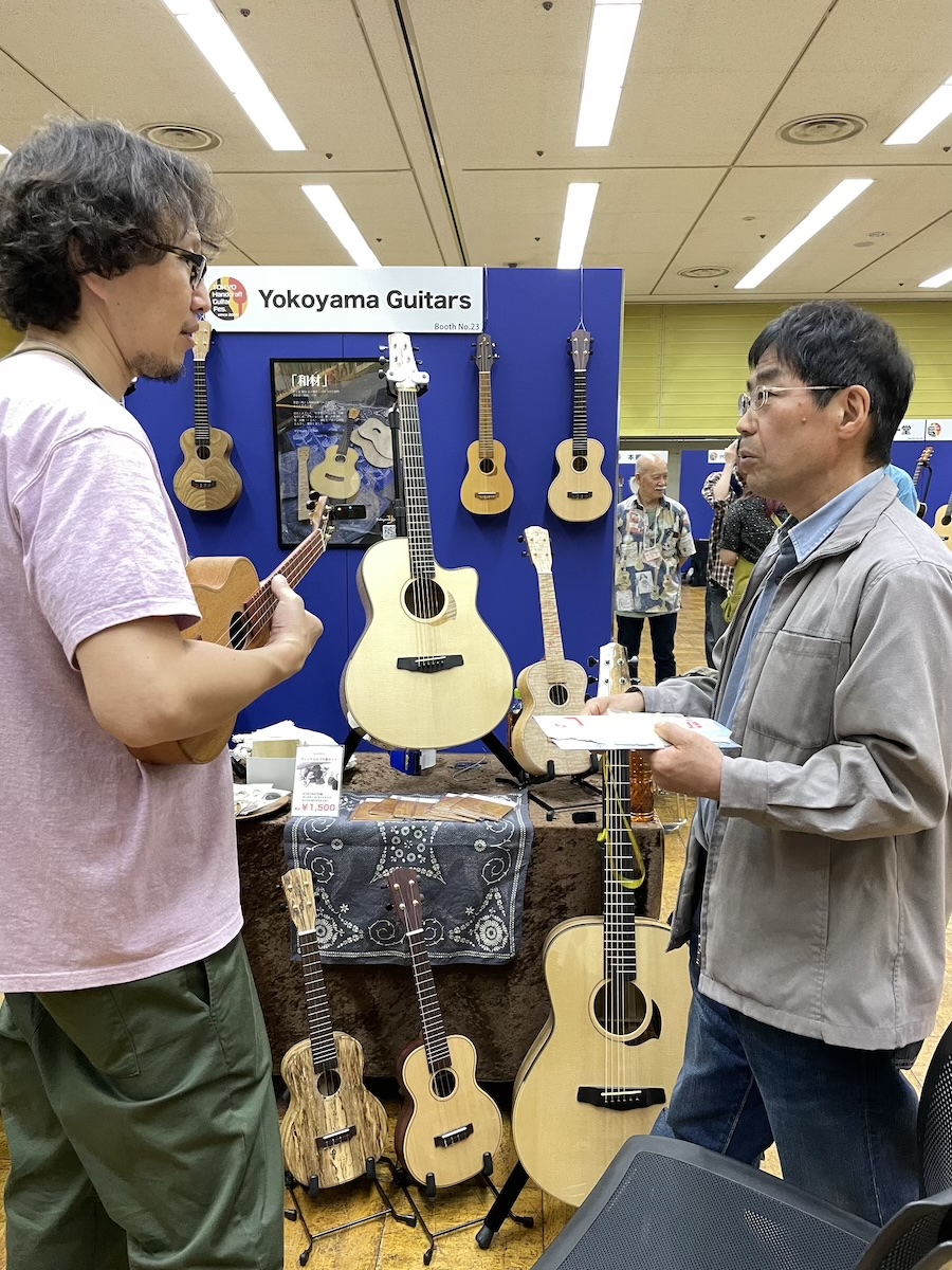 参加の皆さまが、演奏前に各ブースへ大集合です。Yokoyama Guitarsブースには昨年ご購入いただいたお客様が、愛機を抱えてご来場くださいました。