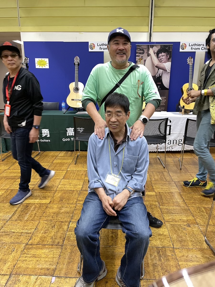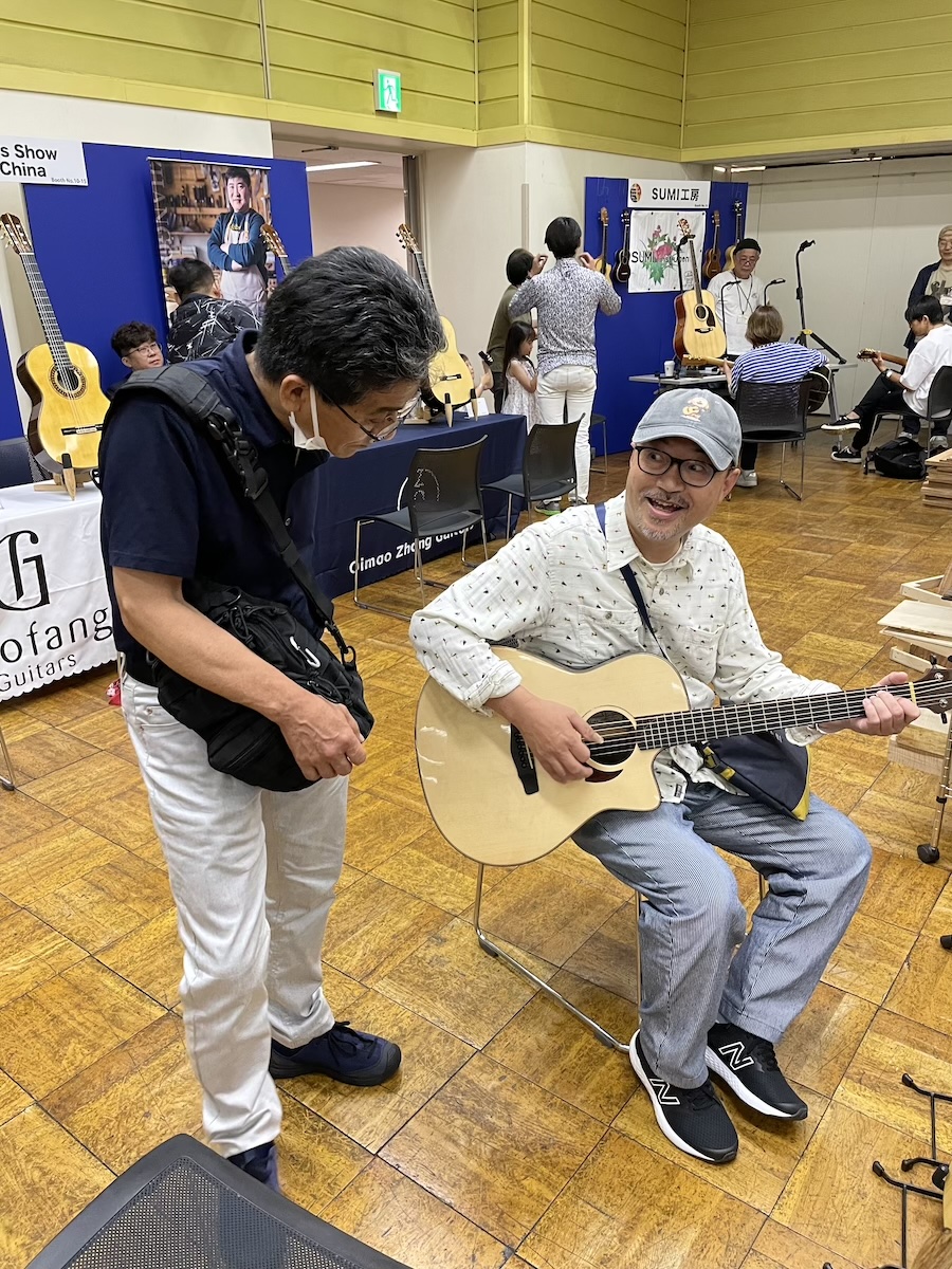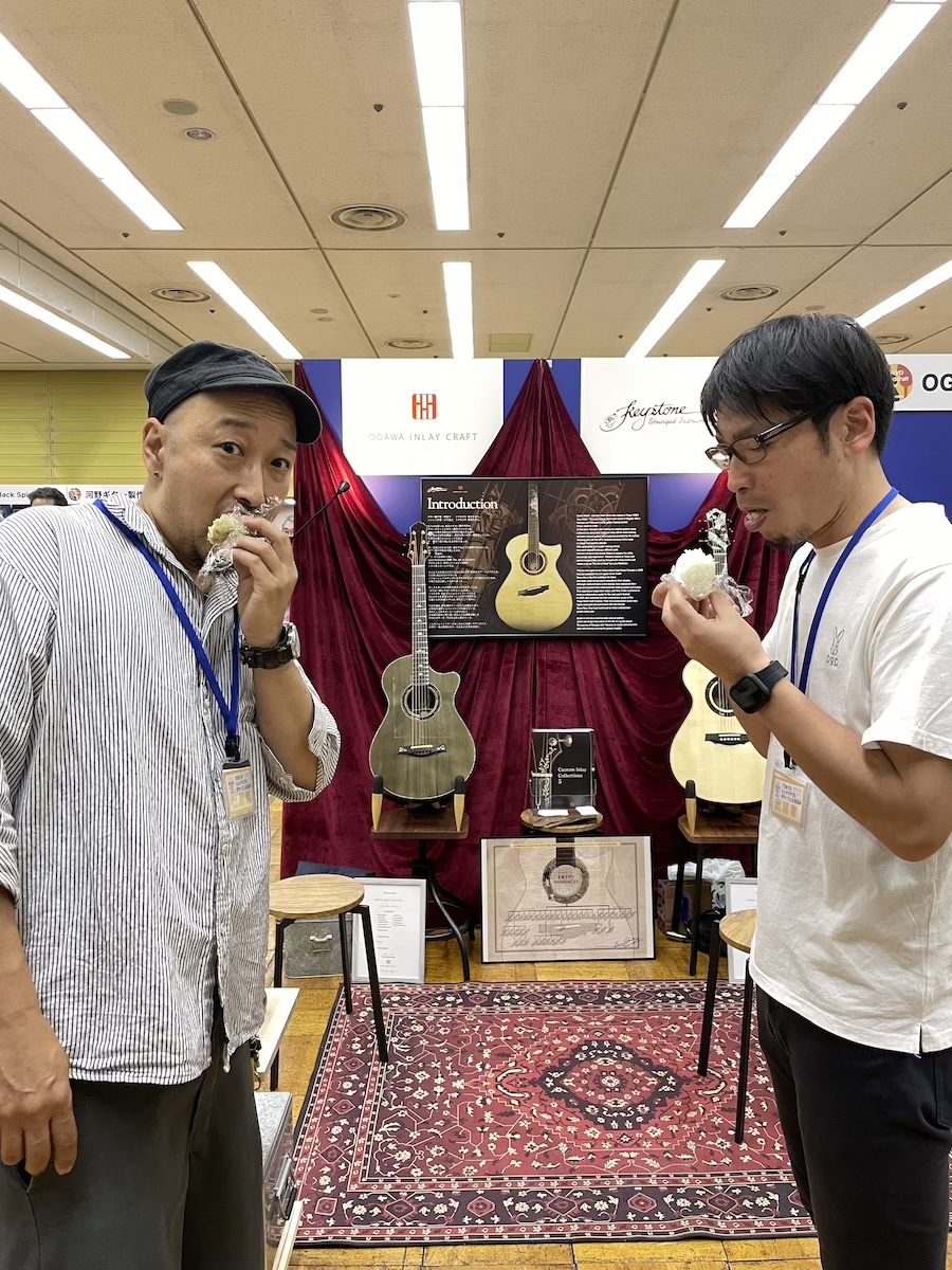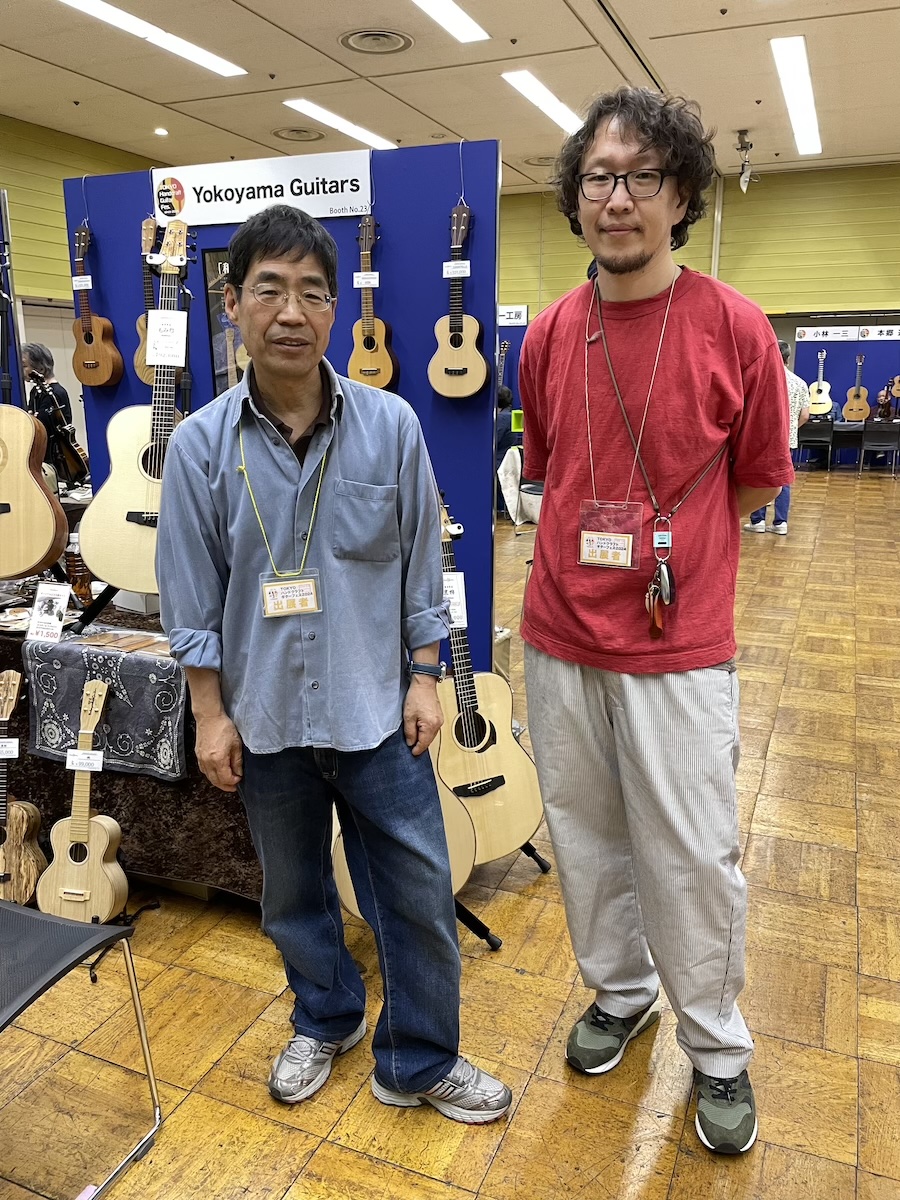参加の皆さまが、演奏前に各ブースへ大集合です。Yokoyama Guitarsブースには昨年ご購入いただいたお客様が、愛機を抱えてご来場くださいました。