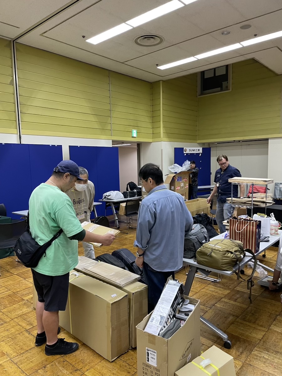 運び込んだら、設置まではあっという間。「和材」ポスターを新調し、ディスプレイには、お気に入りの「 BANDAIYA 」さんのバンダナも持参しました。