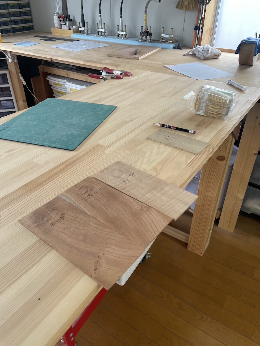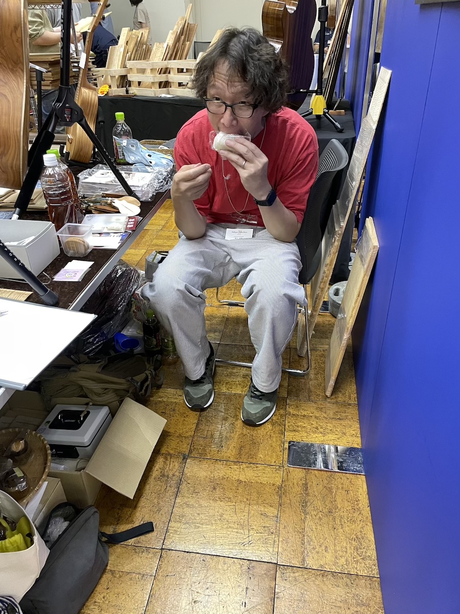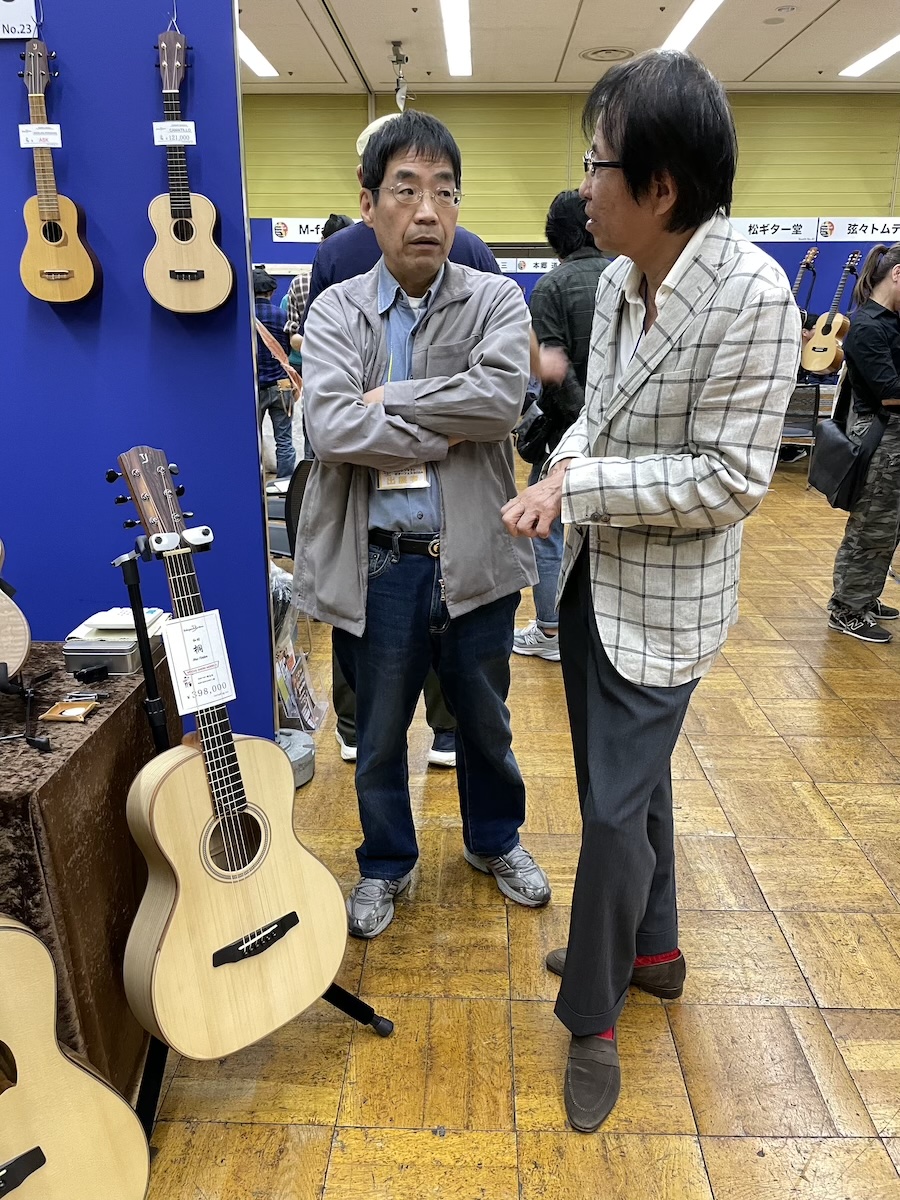 時間がある時に、製作者同士の情報交換タイム。皆さん、和材の話題で持ちきりでした。やはり珍しい材料ですから、この機会に音もチェックしていただきました。