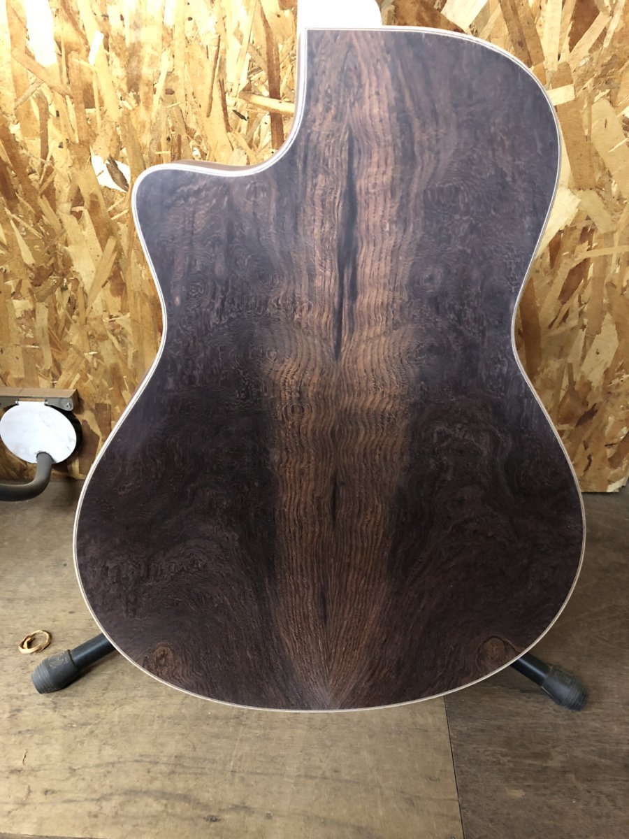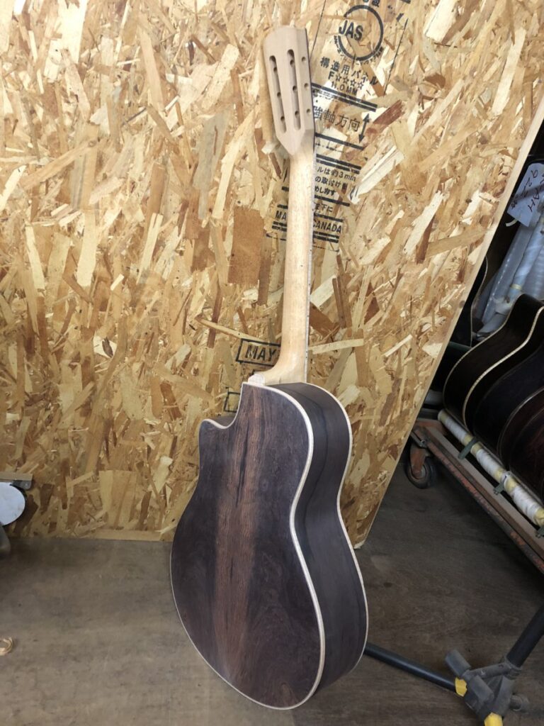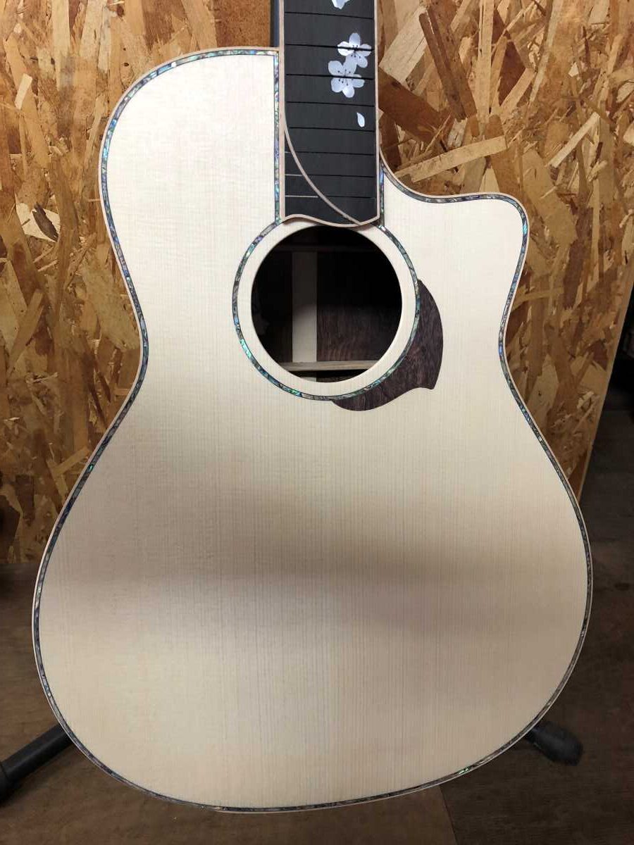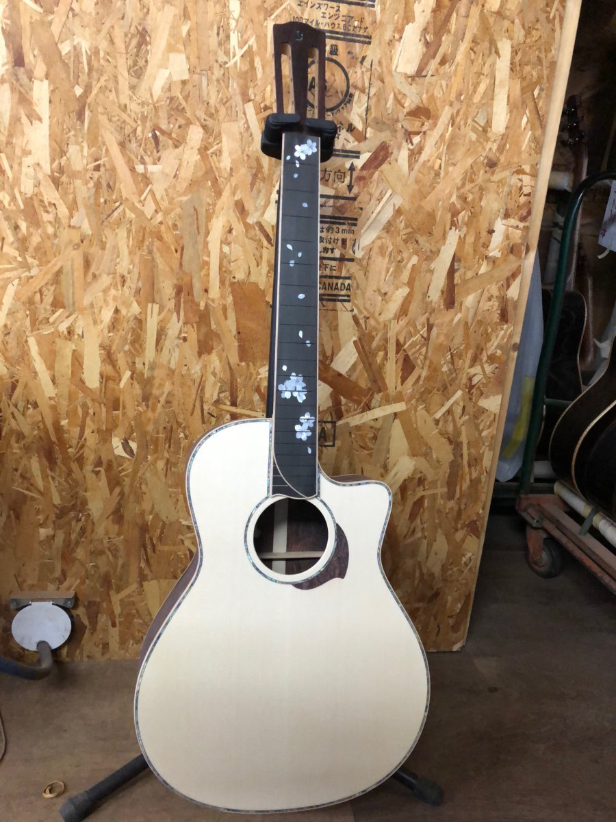 トップはジャーマンスプルース、バック&サイドはブラジリアンローズウッドです。とてもキレイな仕上がりです。完成形はここに塗装がのりますので、より煌びやかなルックスに仕上がります。ボディ外周のアバロンもお客様のリクエストです。