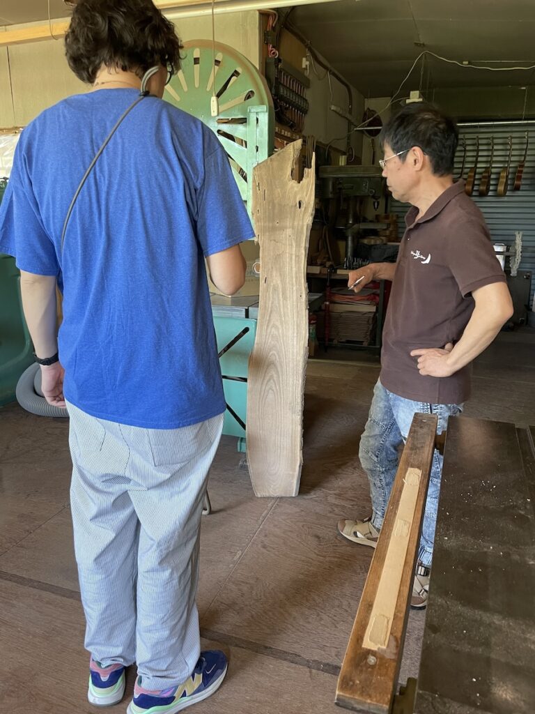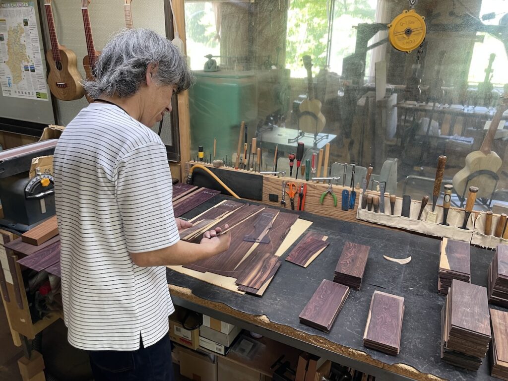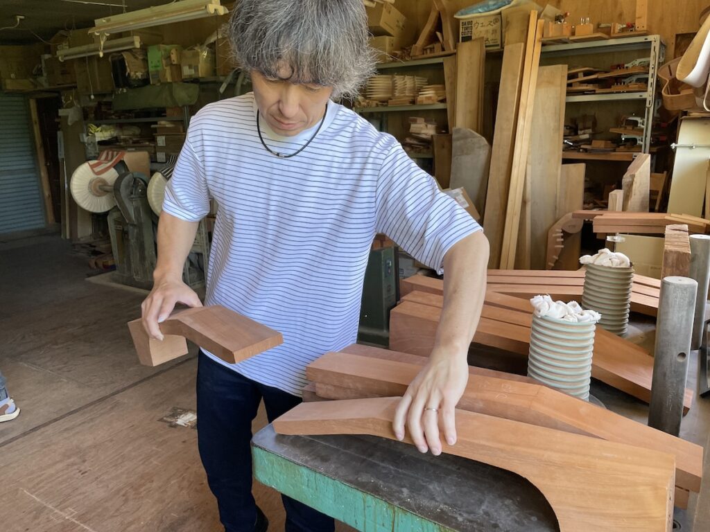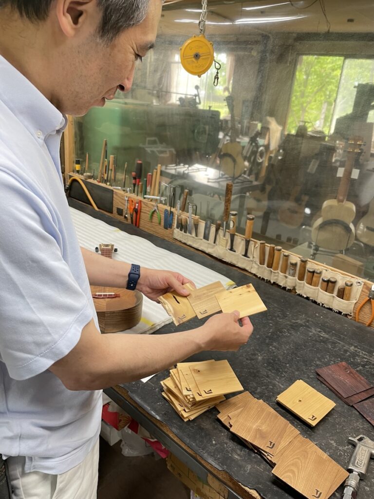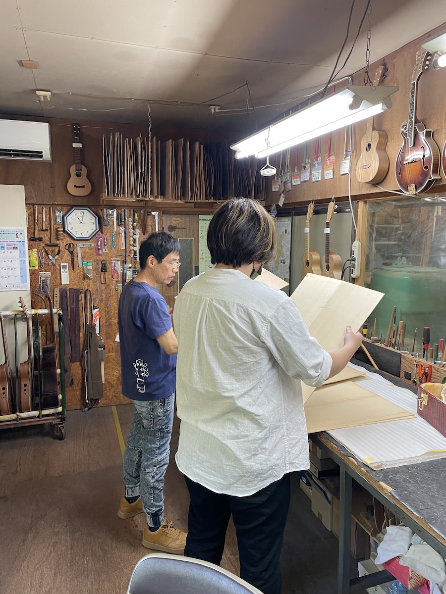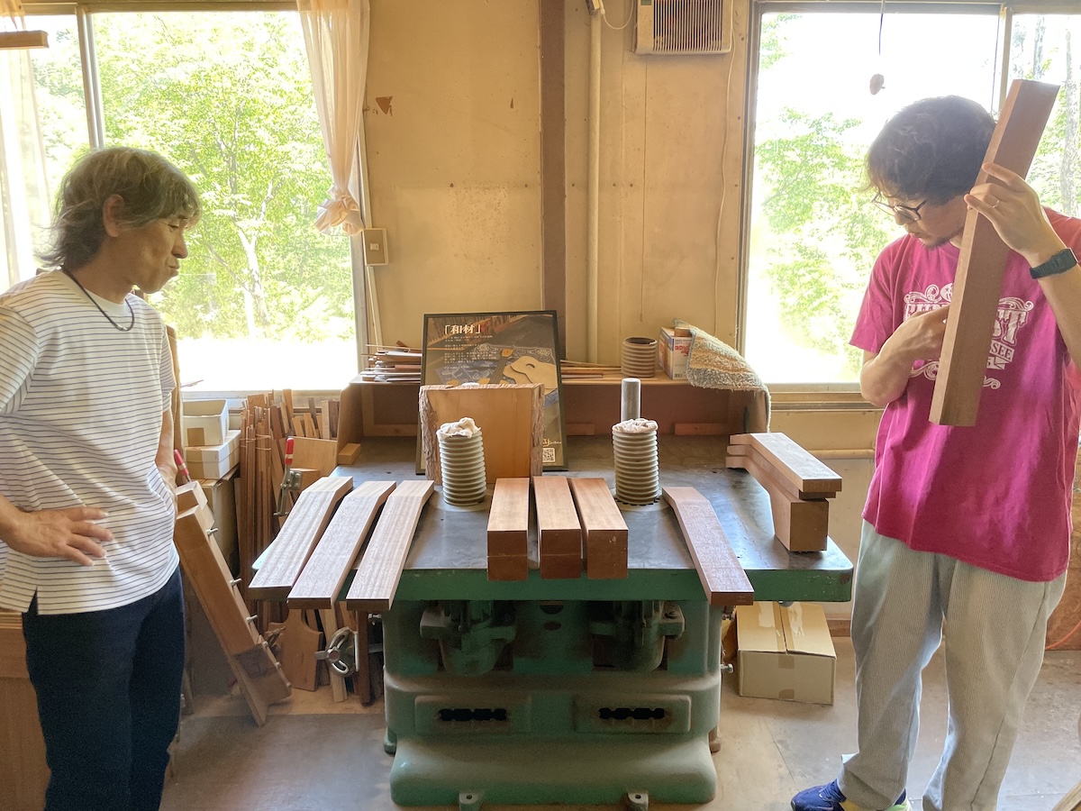 ネック材にもこだわります。実際に材料をタップしながら、自問自答。お好みの一本をお選びいただきました。