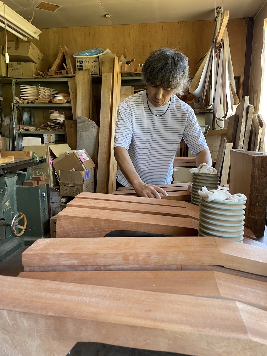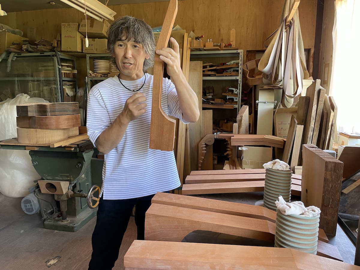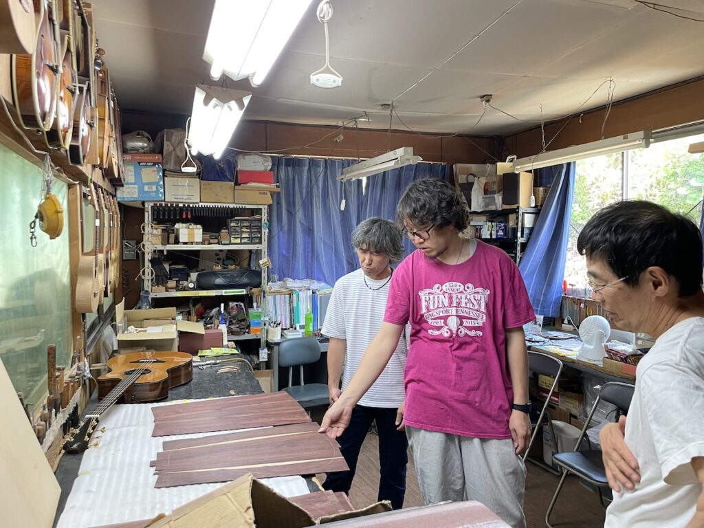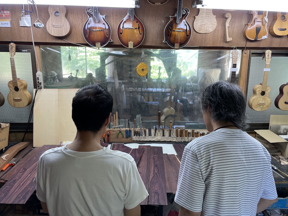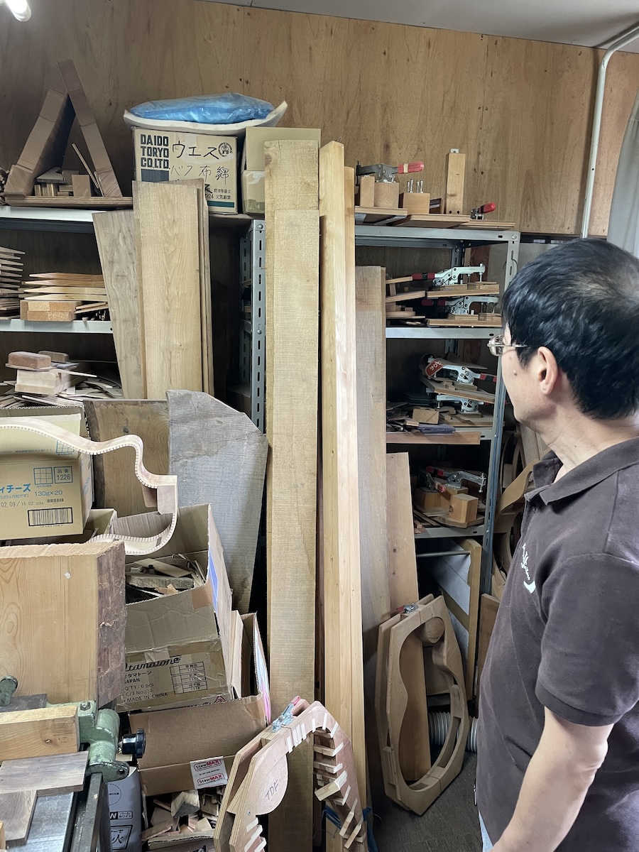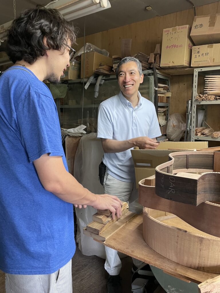 ネック材にもこだわります。実際に材料をタップしながら、自問自答。お好みの一本をお選びいただきました。