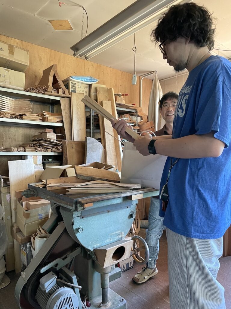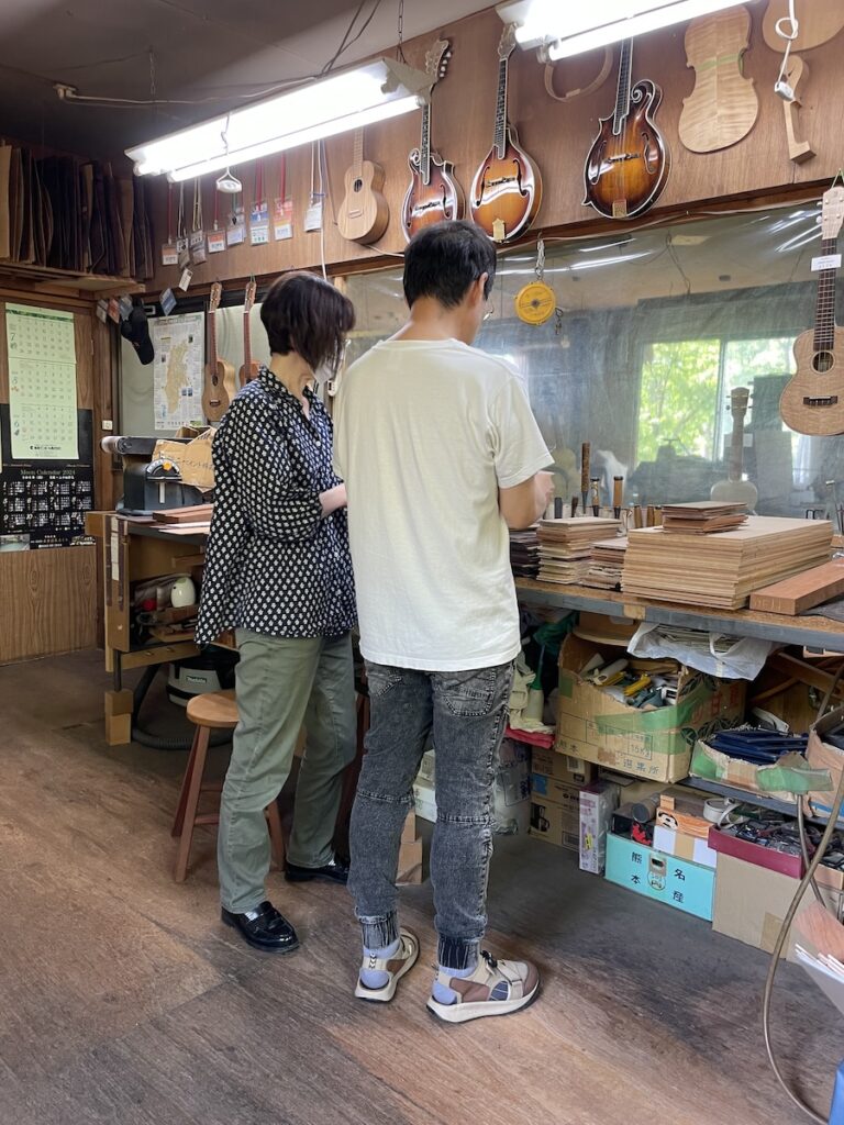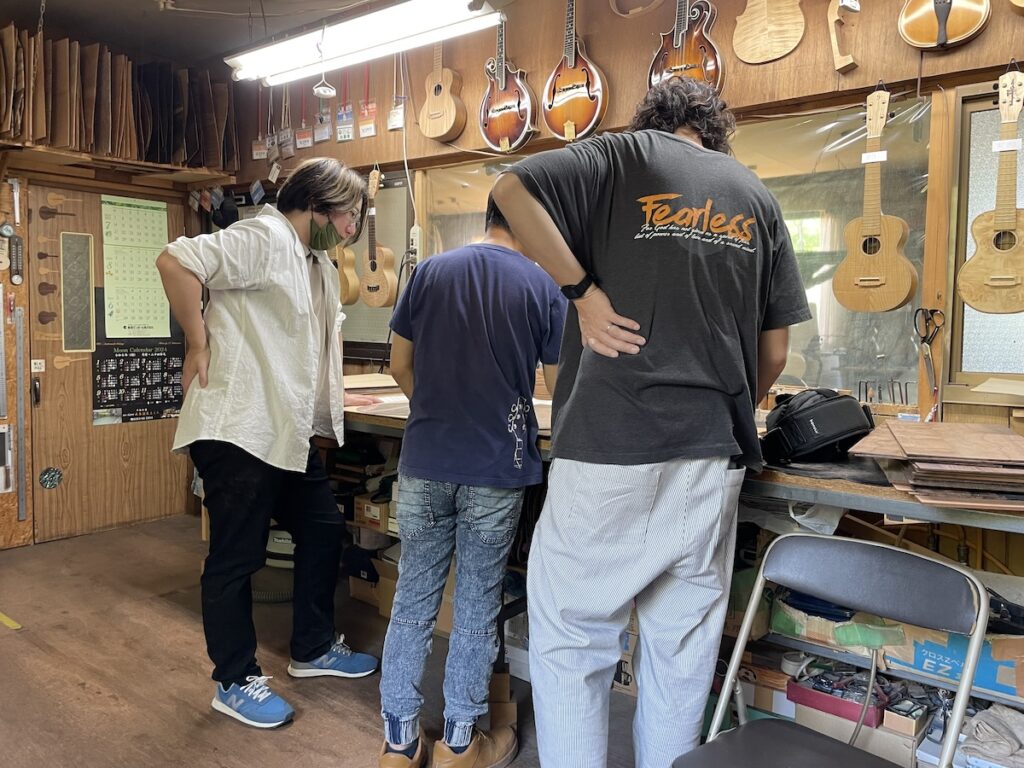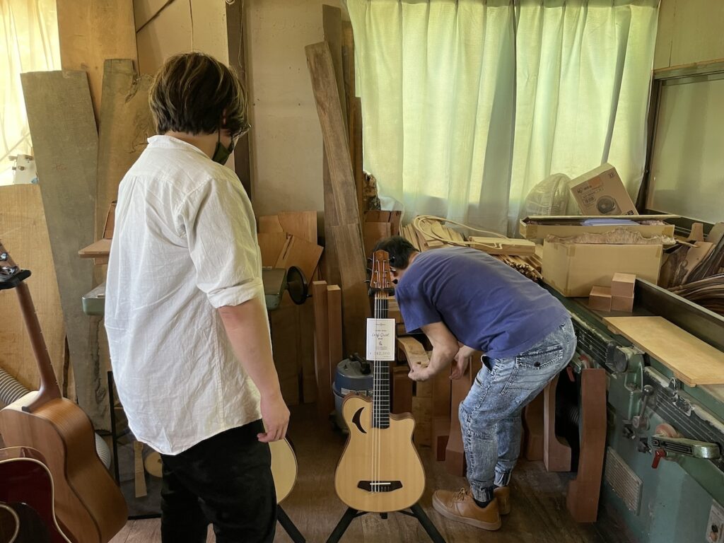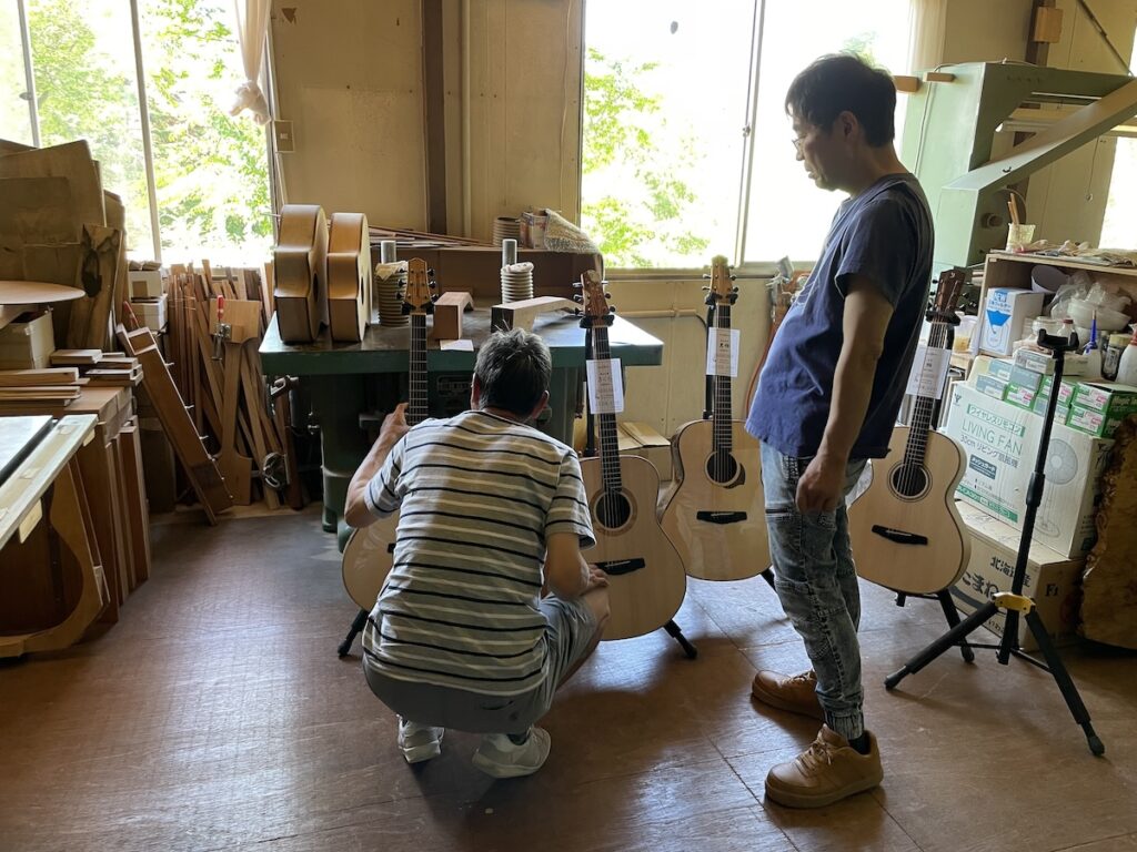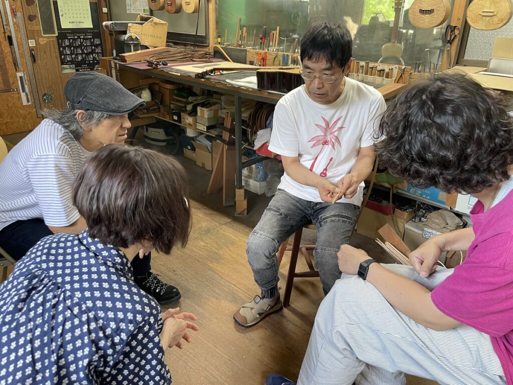 ネック材にもこだわります。実際に材料をタップしながら、自問自答。お好みの一本をお選びいただきました。
