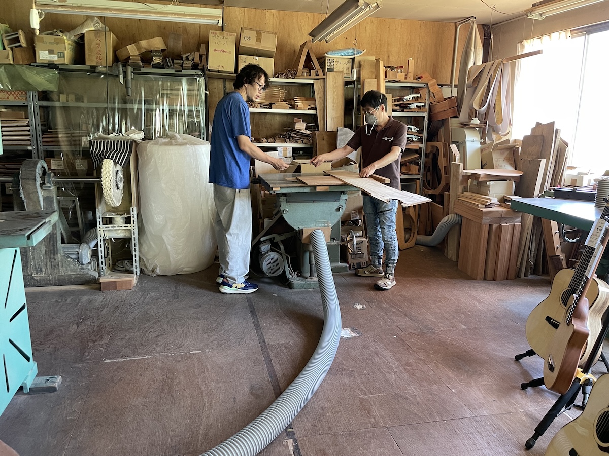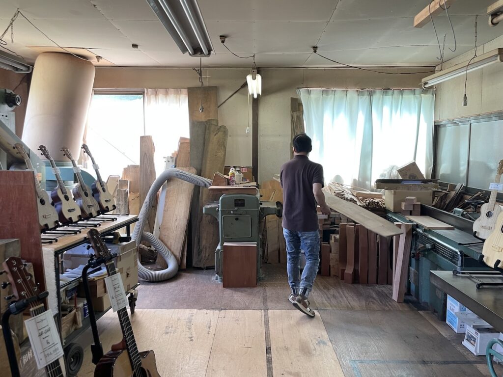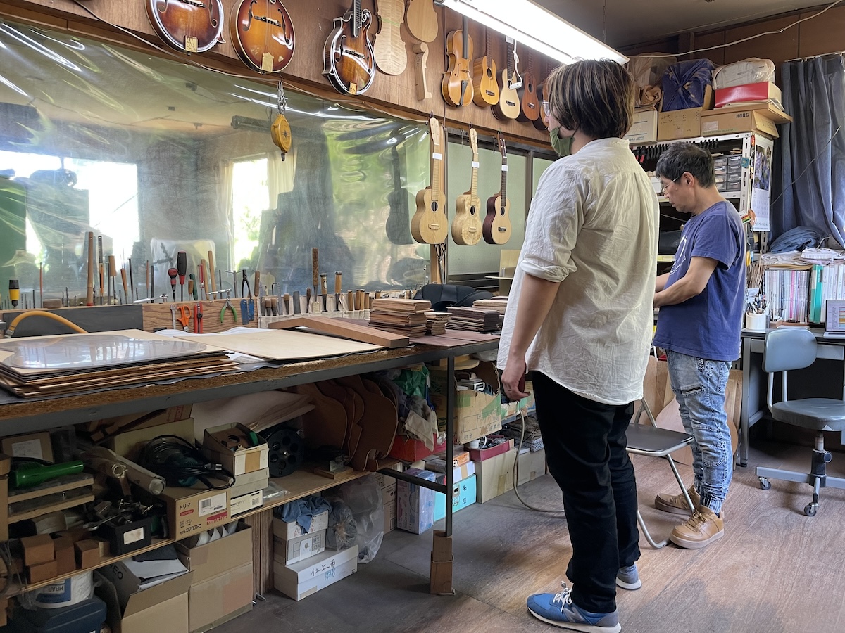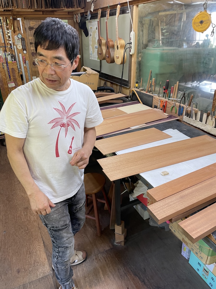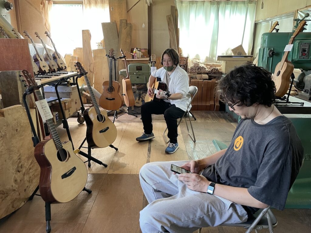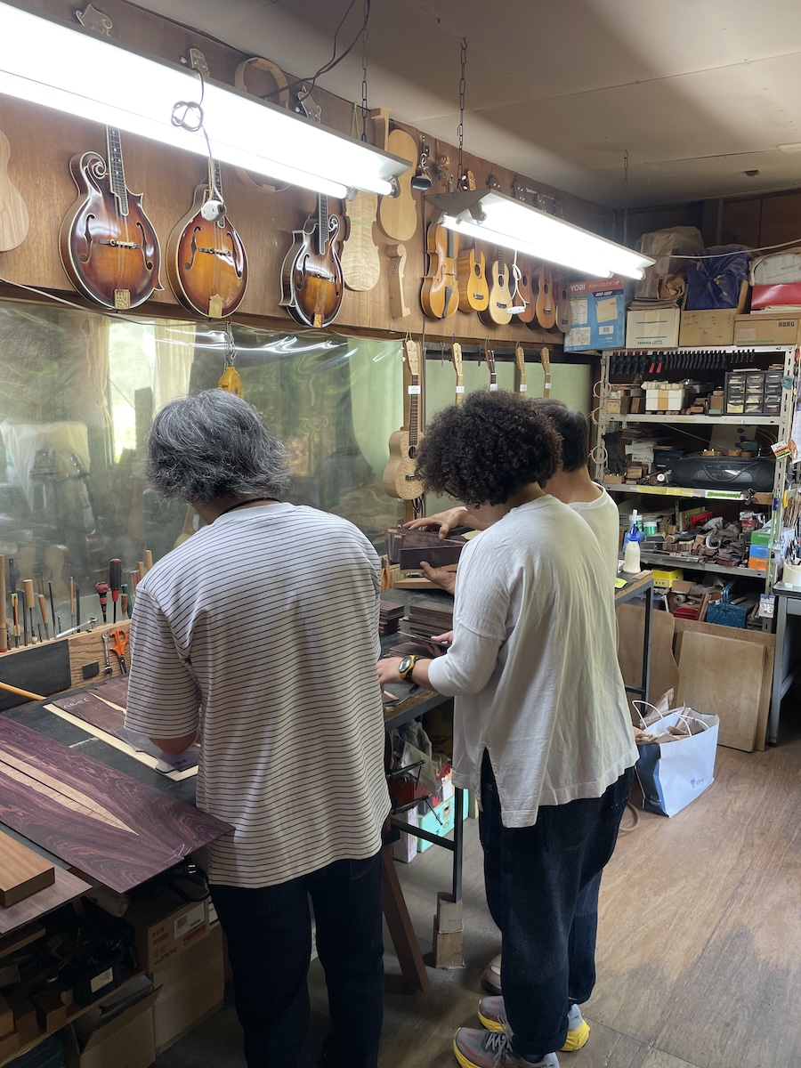 ネック材にもこだわります。実際に材料をタップしながら、自問自答。お好みの一本をお選びいただきました。