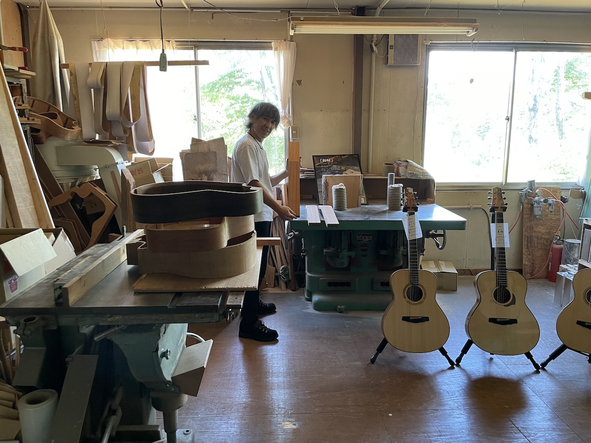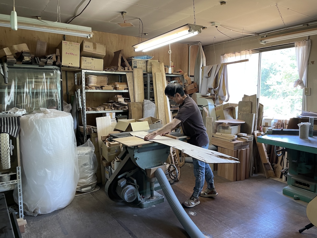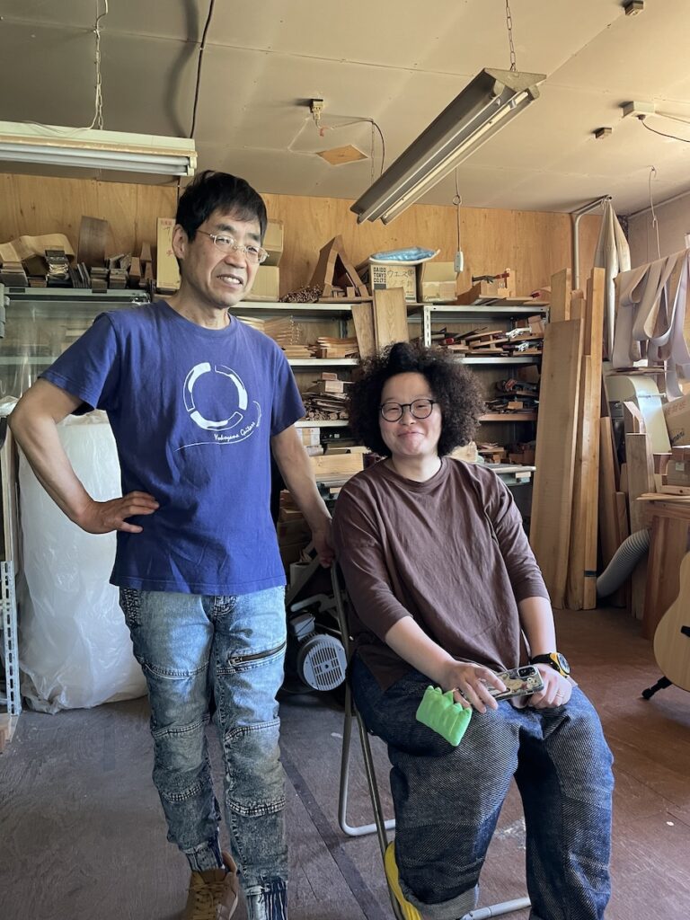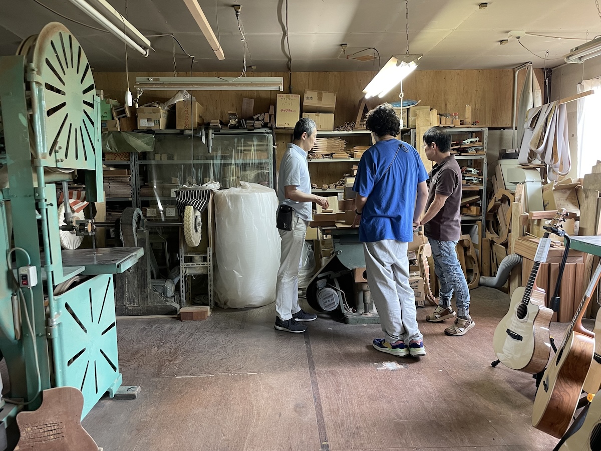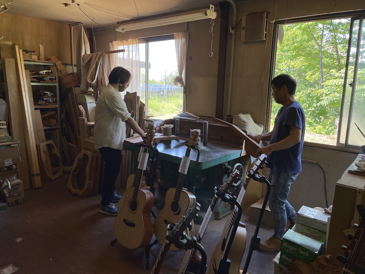 ネック材にもこだわります。実際に材料をタップしながら、自問自答。お好みの一本をお選びいただきました。
