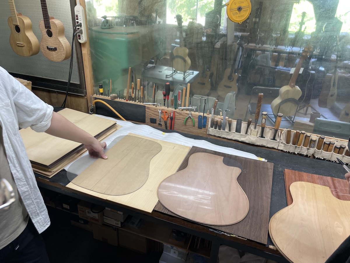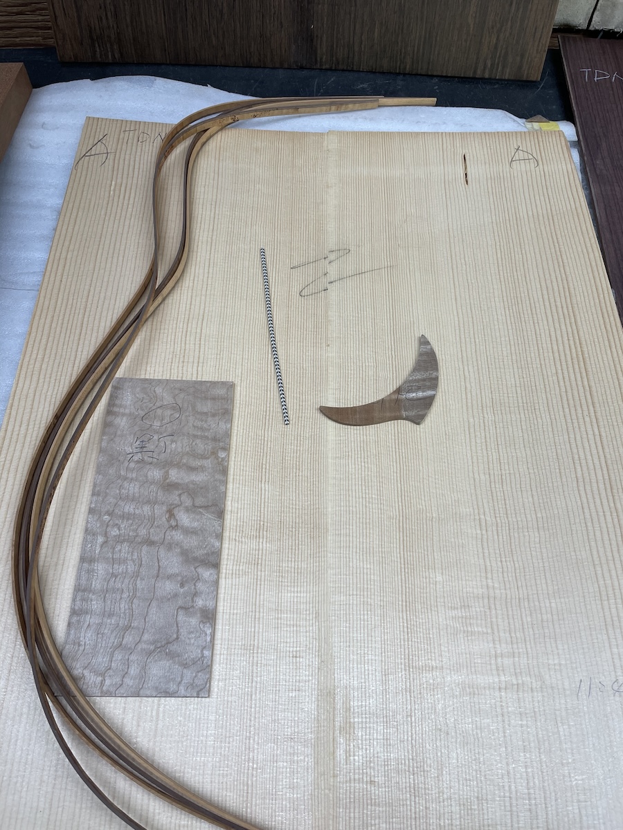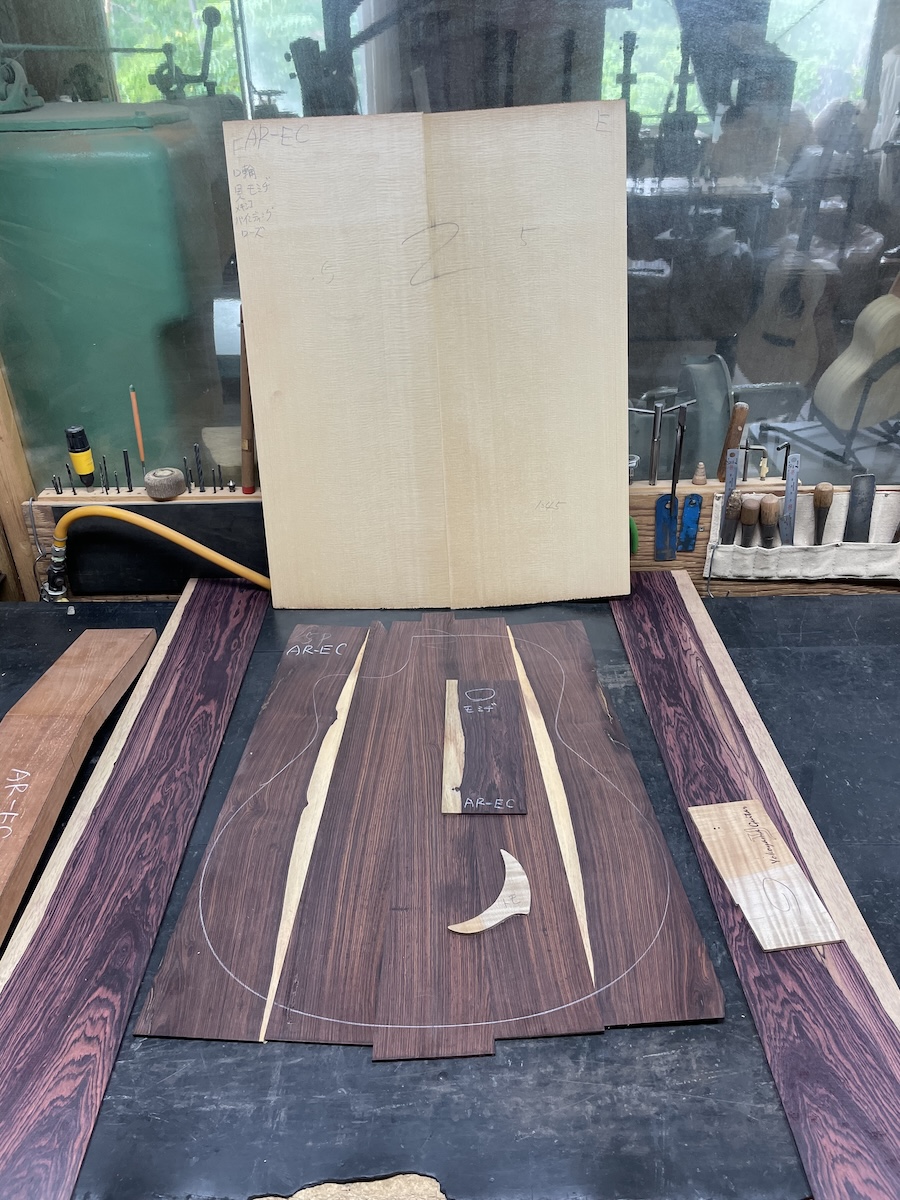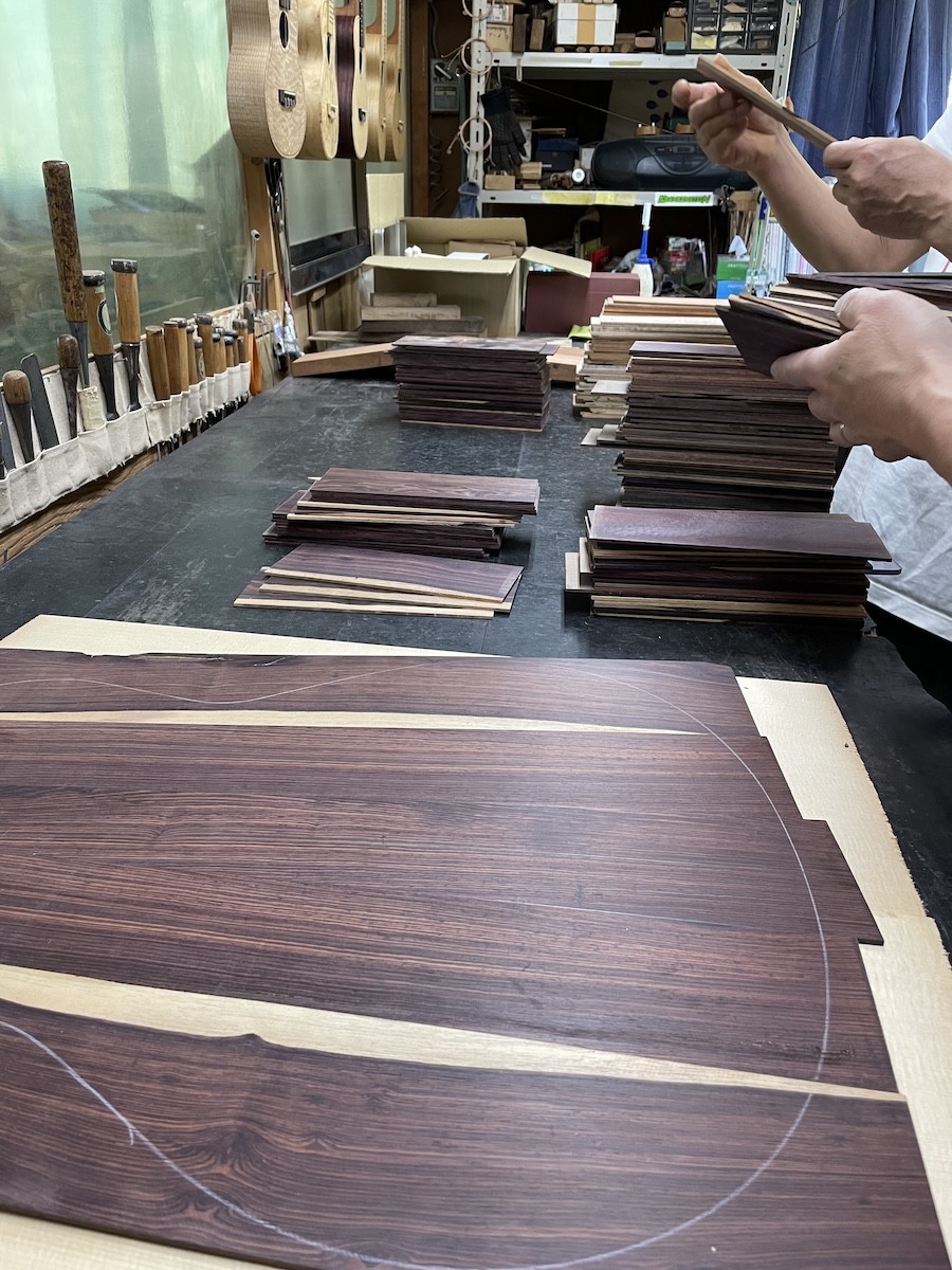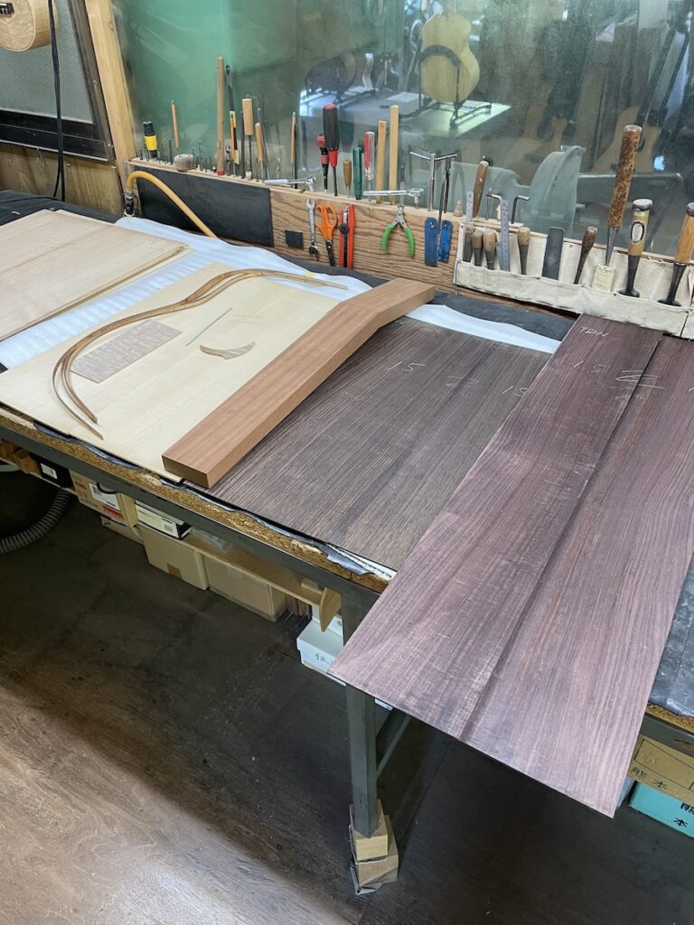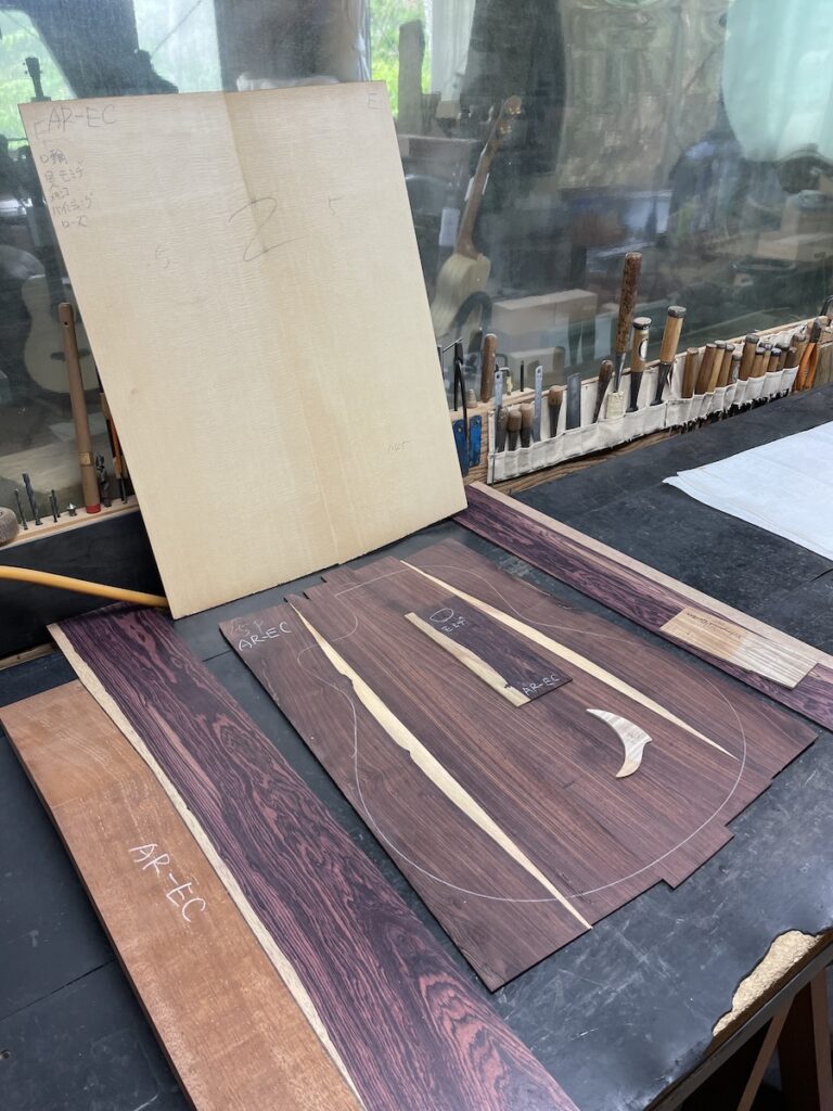 色々とお試しいただいた結果、トップはイングルマンスプルース、バック&サイドはカマティロのARシェイプに決定。完成形をイメージしながら材料を選定していきます。