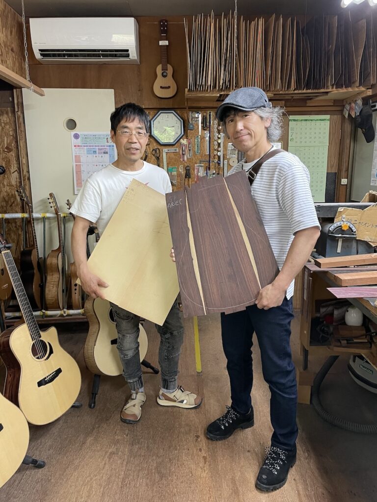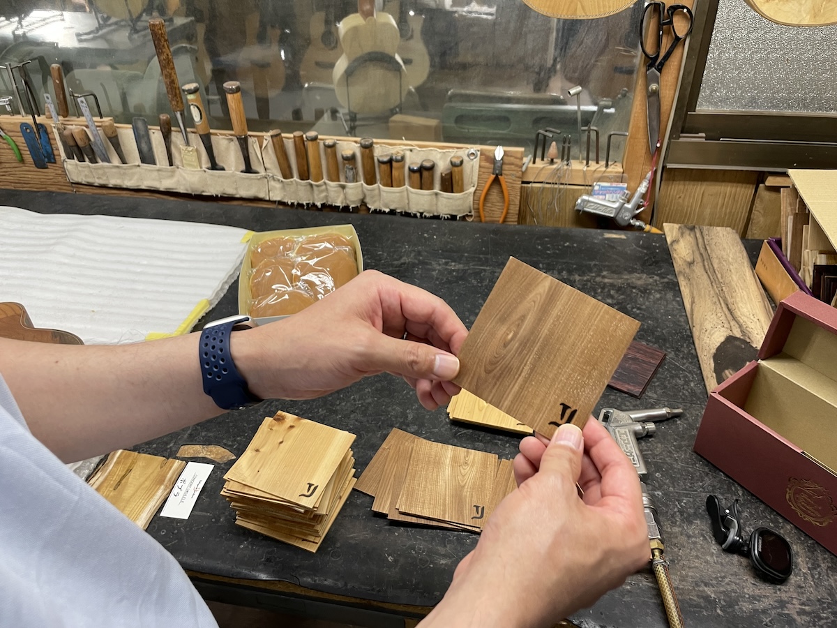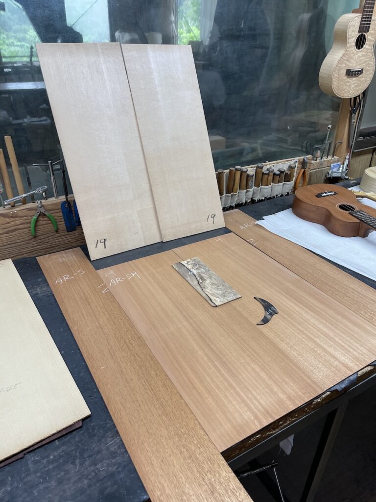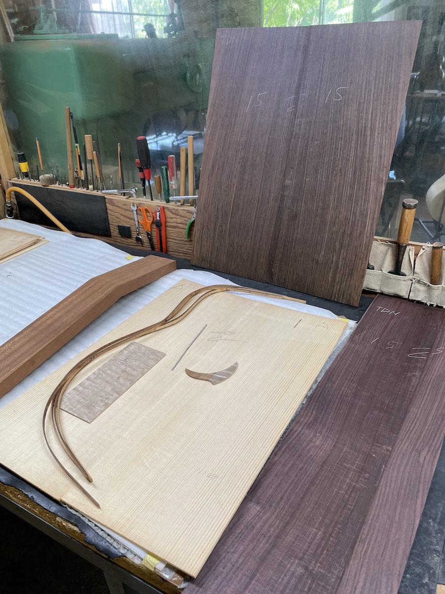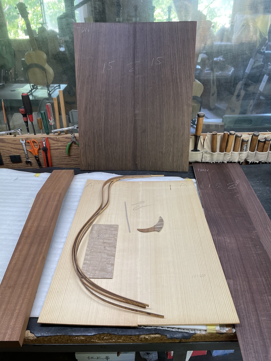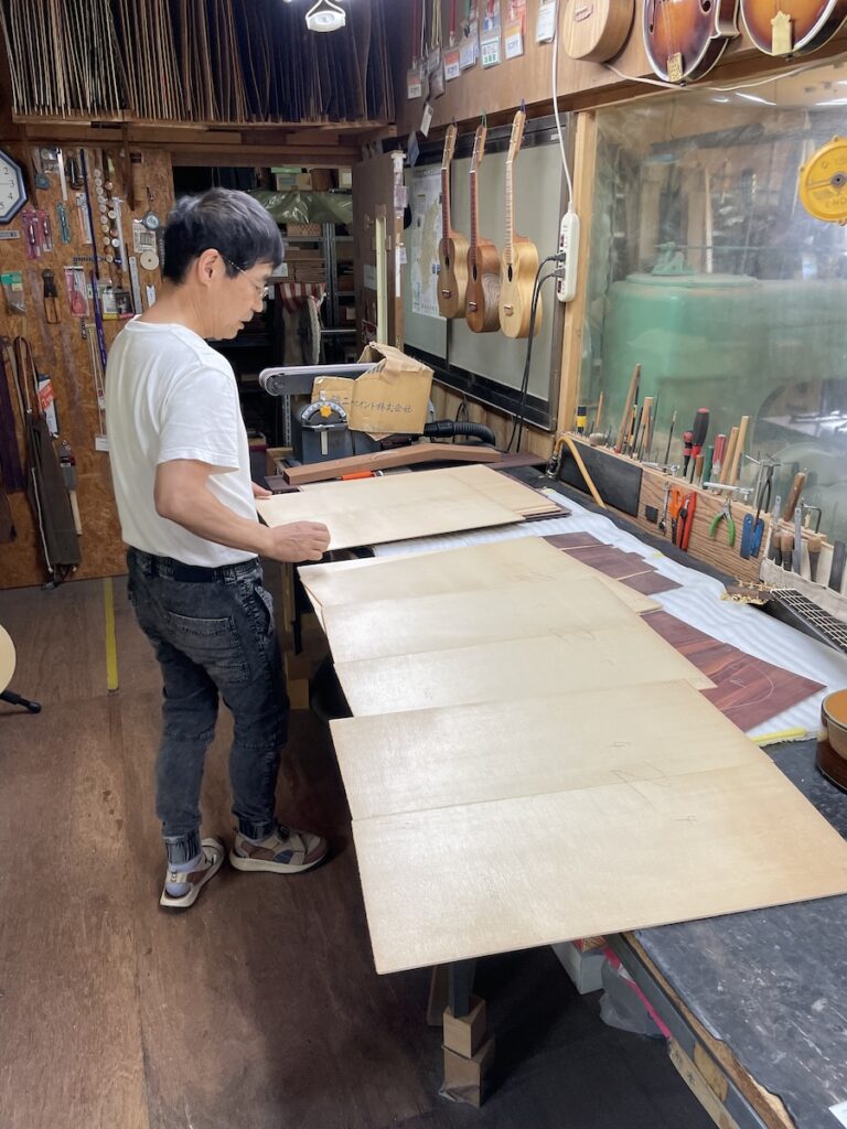 色々とお試しいただいた結果、トップはイングルマンスプルース、バック&サイドはカマティロのARシェイプに決定。完成形をイメージしながら材料を選定していきます。