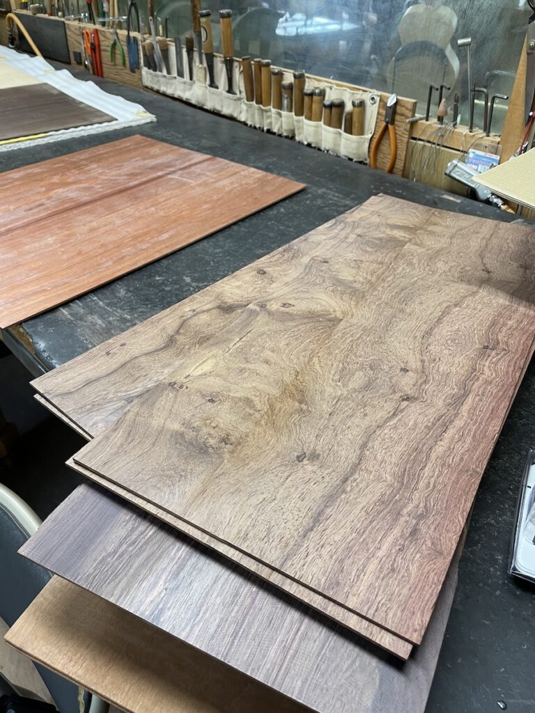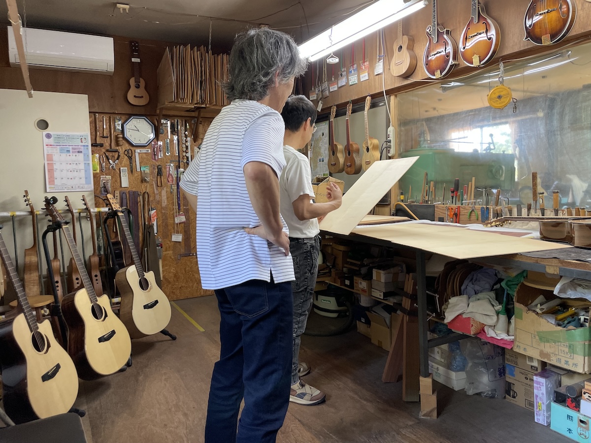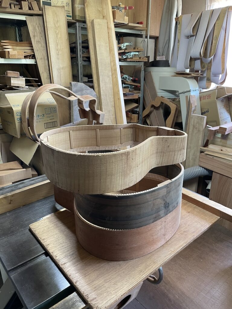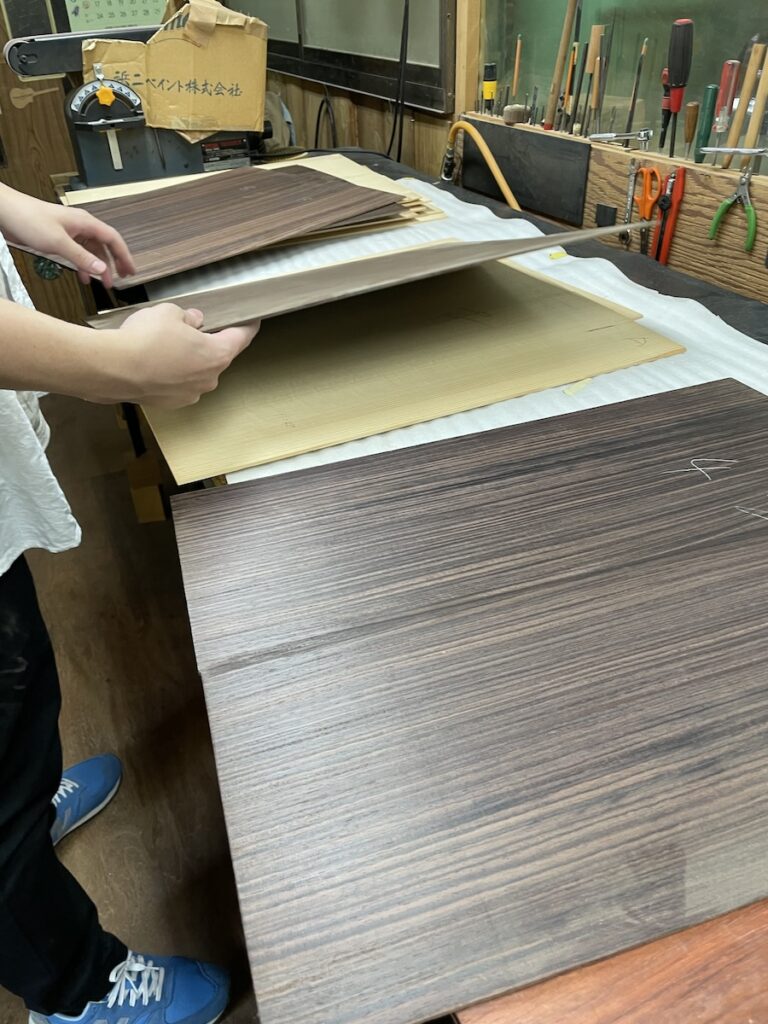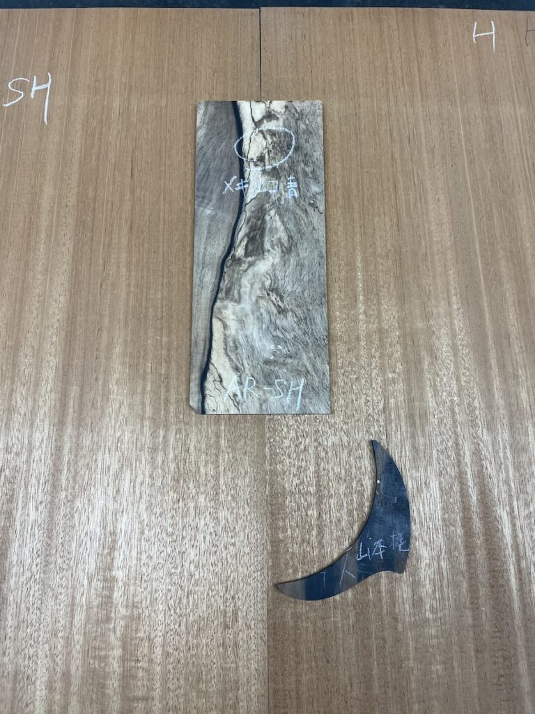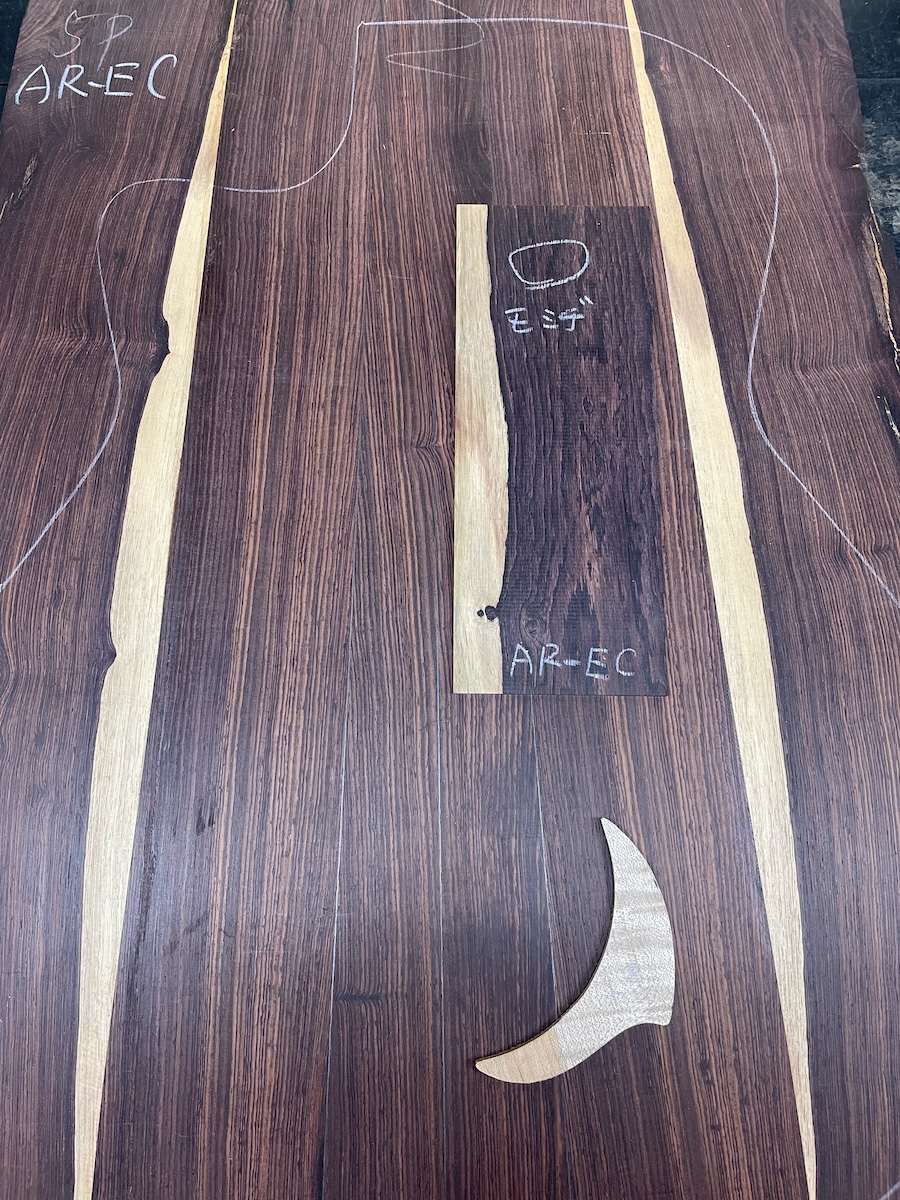 色々とお試しいただいた結果、トップはイングルマンスプルース、バック&サイドはカマティロのARシェイプに決定。完成形をイメージしながら材料を選定していきます。