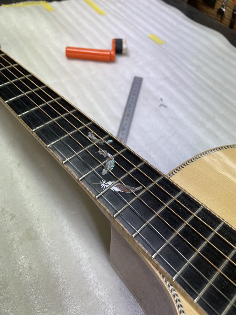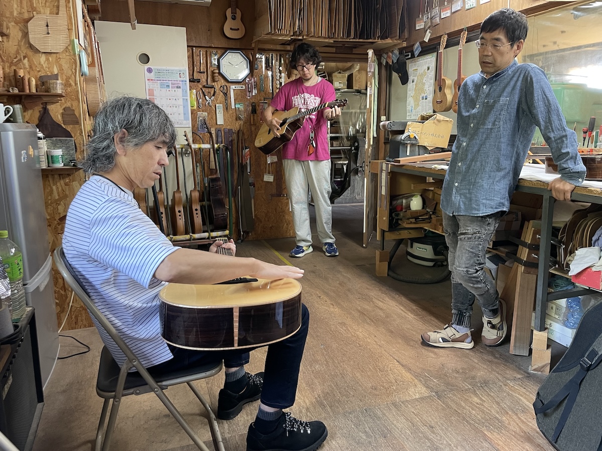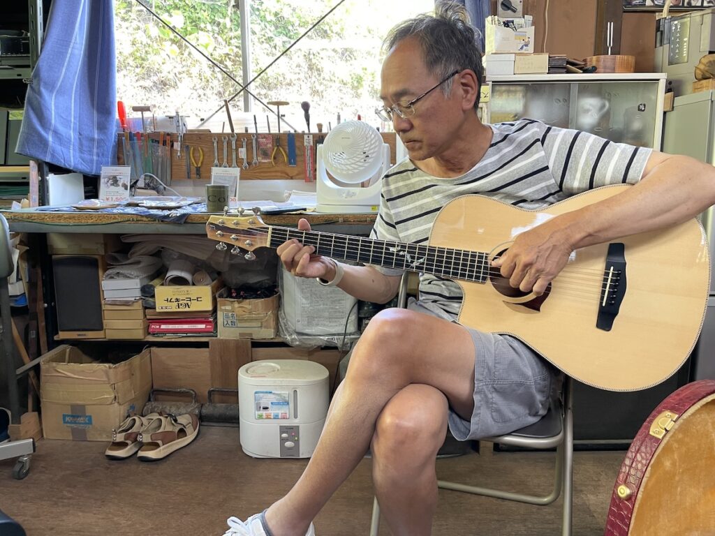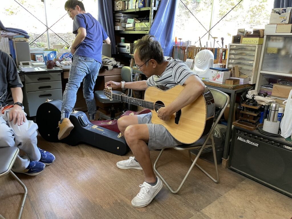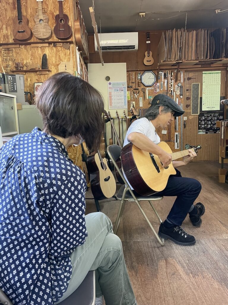そうなのです、M様は左利きなのです。M様に弾いてもらい、ギターをチェックします。2本お持ち込みいただきましたが、1本は調整、もう1本はサドルを新しく製作します。