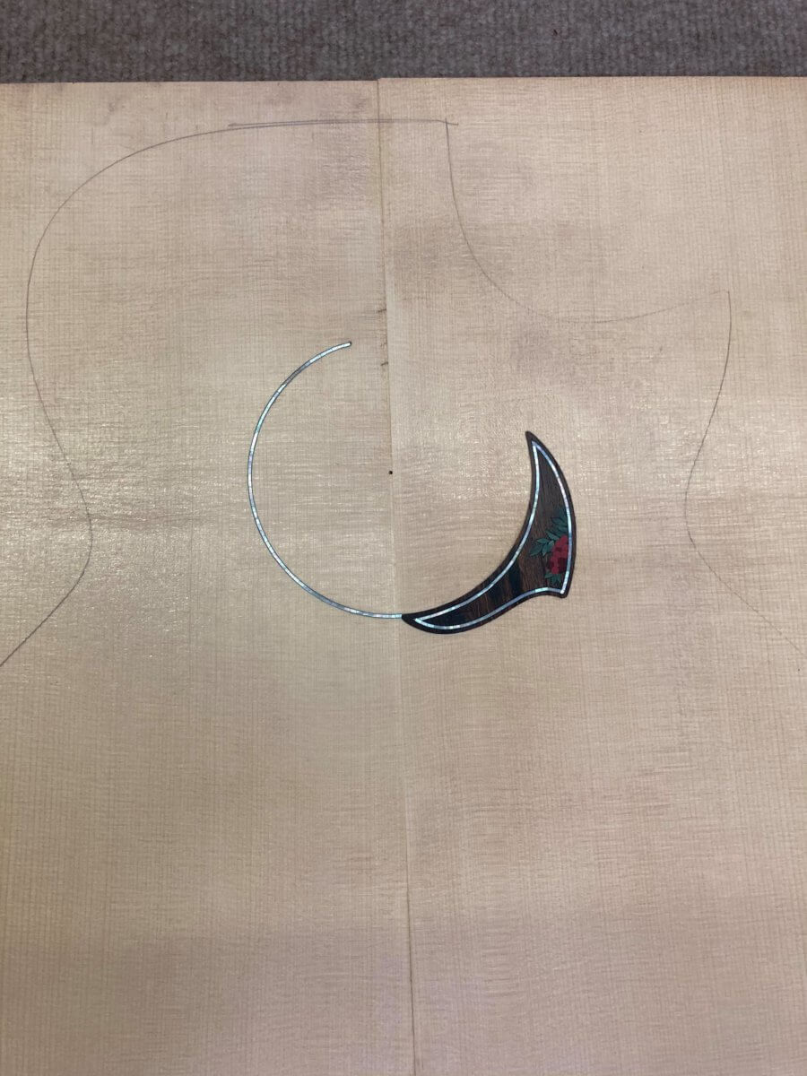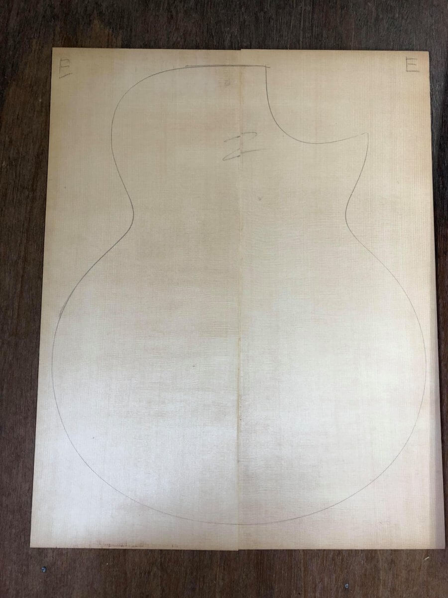 工房よりリモートで選定いただいた材料は、ボディトップがイングルマンスプルース。こちらは工房を立ち上げてから早い段階で入手した材料で、かれこれ10年以上は経過した良材です。