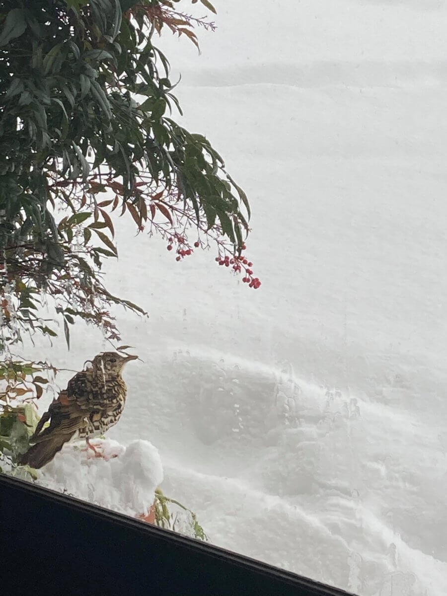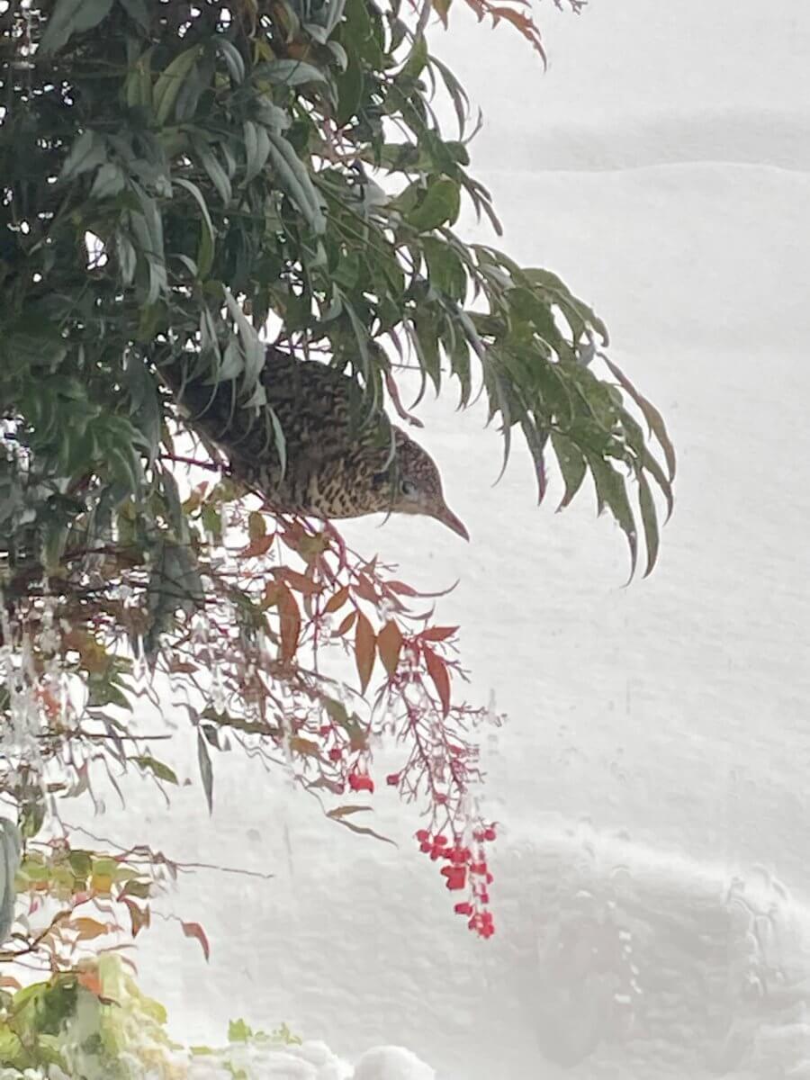 >やりたいテーマは、「南天にムクドリ」です。ウチの工房の玄関に南天があるのですが雪解けの春先に雪をかぶった南天にムクドリが赤い実をついばみにやってくるんです。