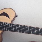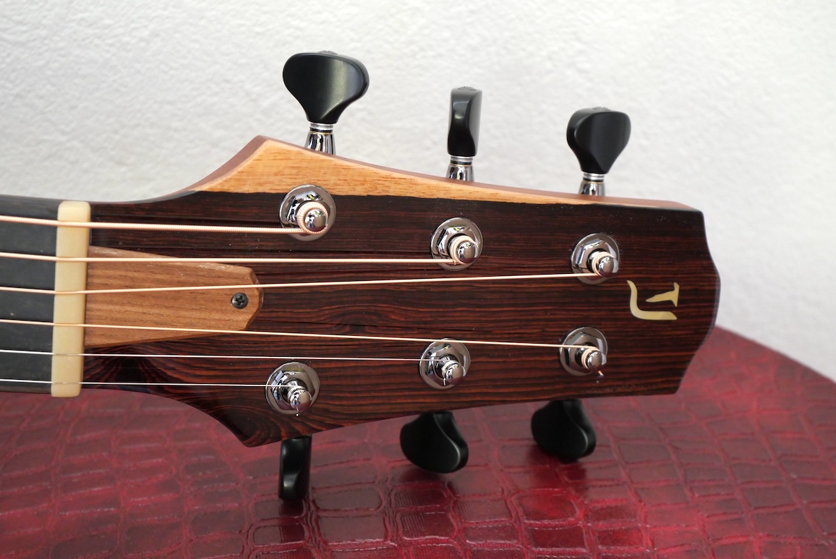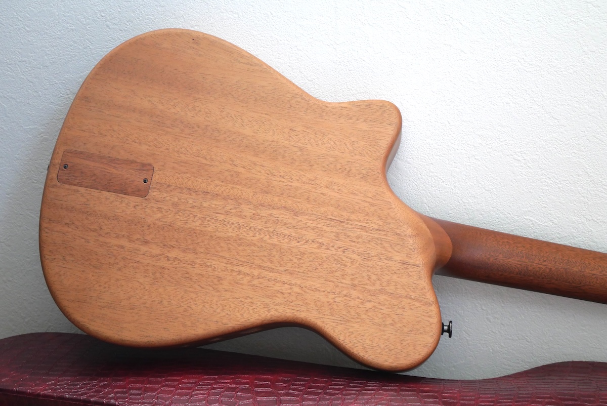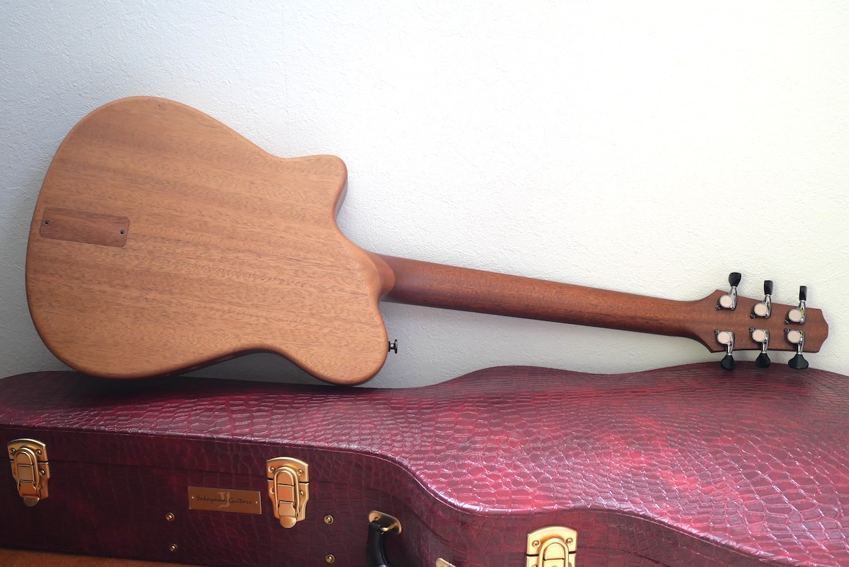 コンセプトは、「コンパクトなアコースティックギター」。チェンバードボディを採用し、ネックまわりのプレイアビリティは、普段製作している「Yokoyama Guitars」同様のスケール、ナット幅を採用。ヘッド形状、ネックグリップも同じに仕上げてあります。