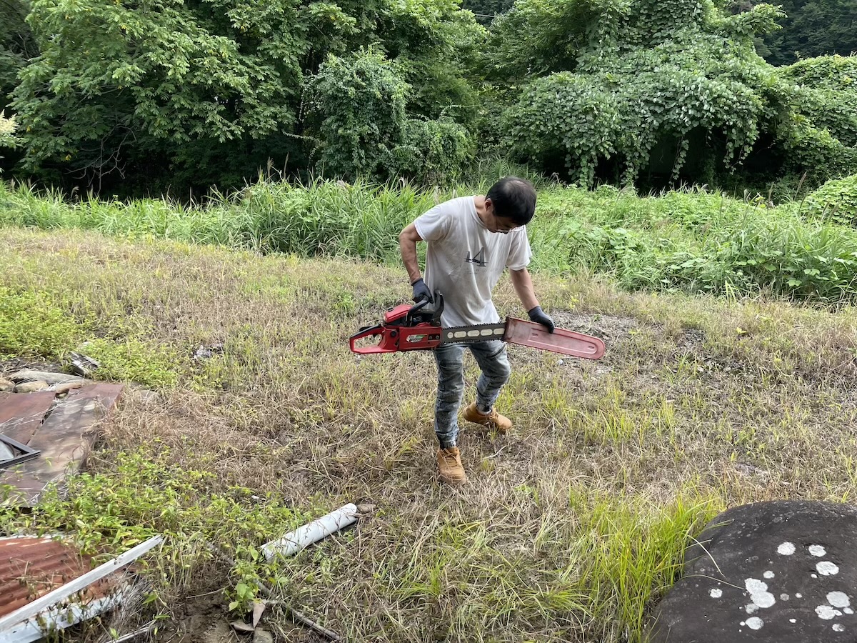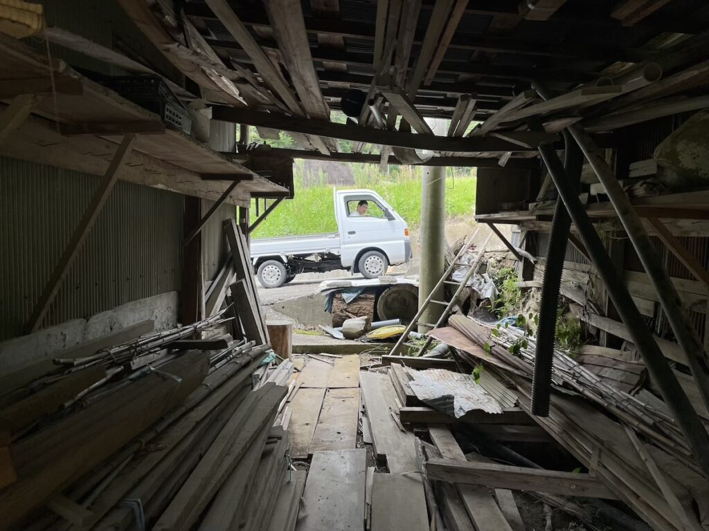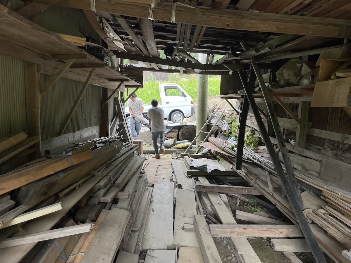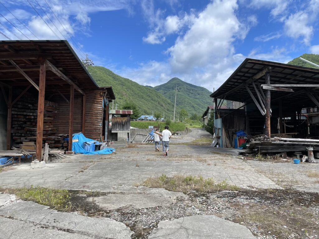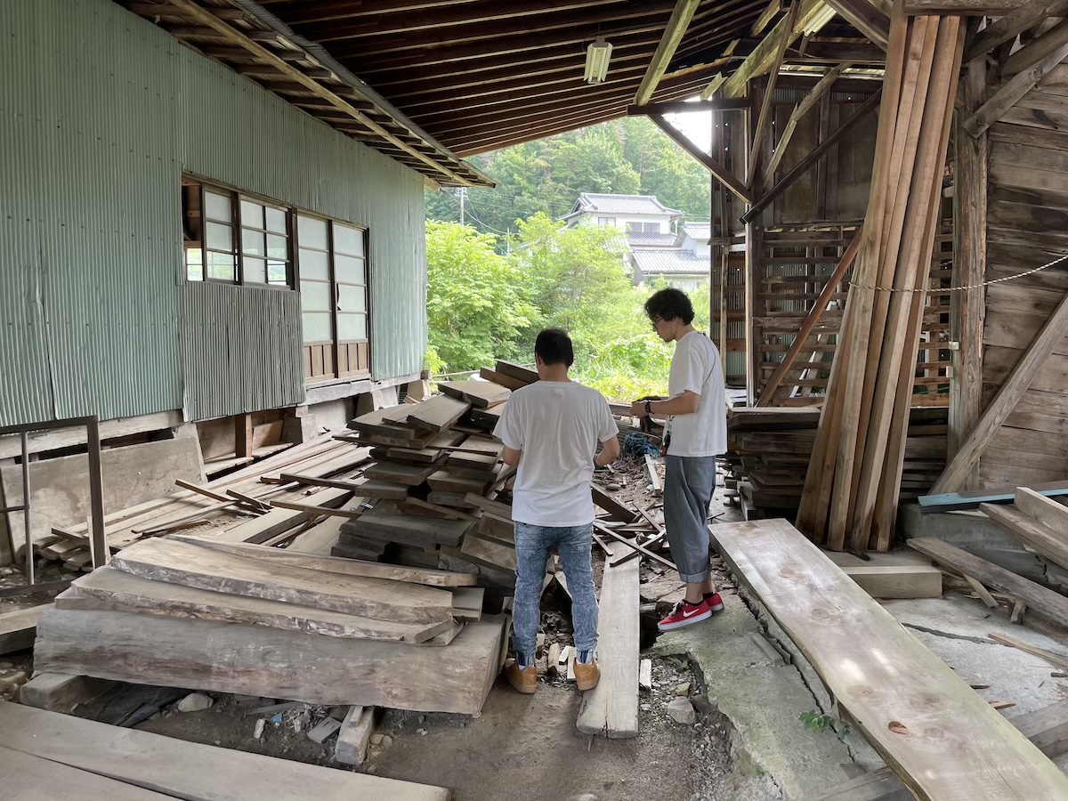 実は、工房の近くに以前建材を扱っていた大きな倉庫があり、そこまで材料を物色しに行く事にしたのです。地元の同級生が管理している秘密のスポットです。