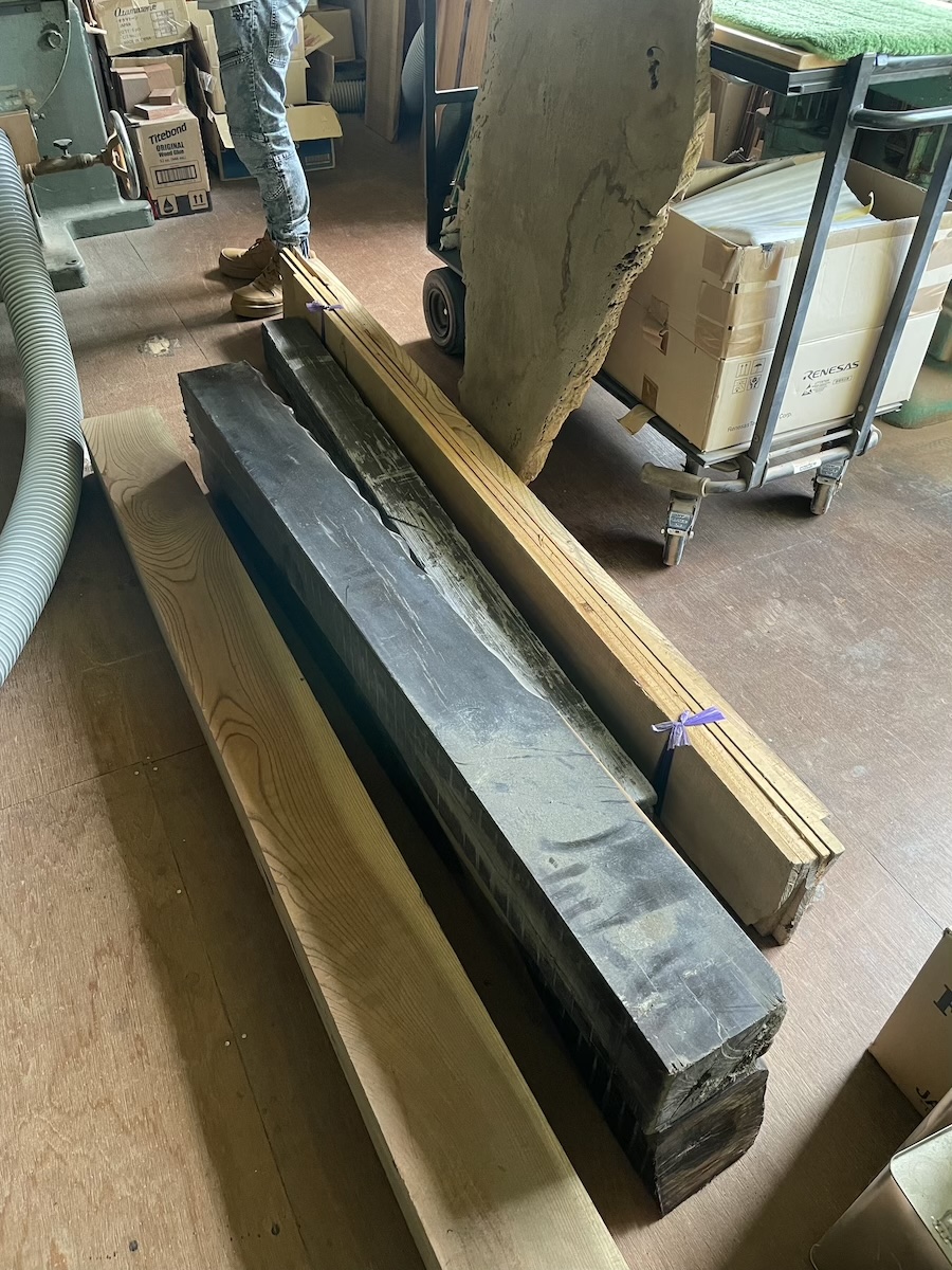 まずは楽器の材料ではなく、TOKYO OFFICE組リクエストの素材の物色から。なにしろ広い倉庫で、木材を見て回るだけで大変です。