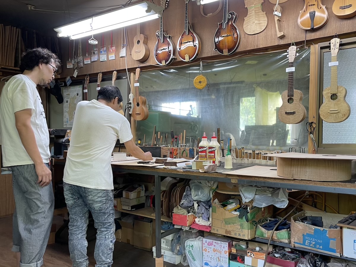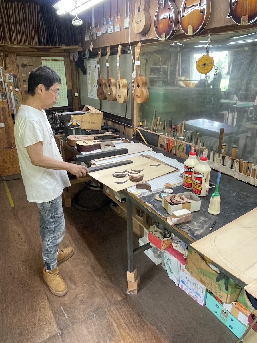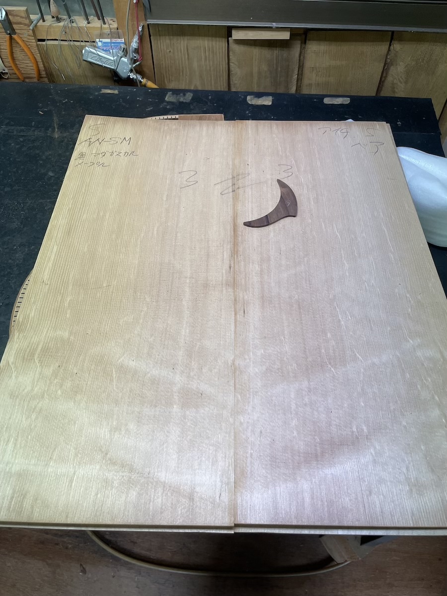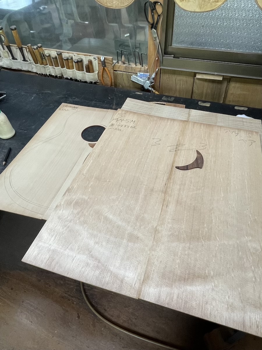 「秘密基地」はこれで一旦切り上げ。工房に戻って、2025年お年玉ギターの最終仕様の確認です。トップ材とロゼッタ、バインディング材等を決定し、製作を進めていきます。