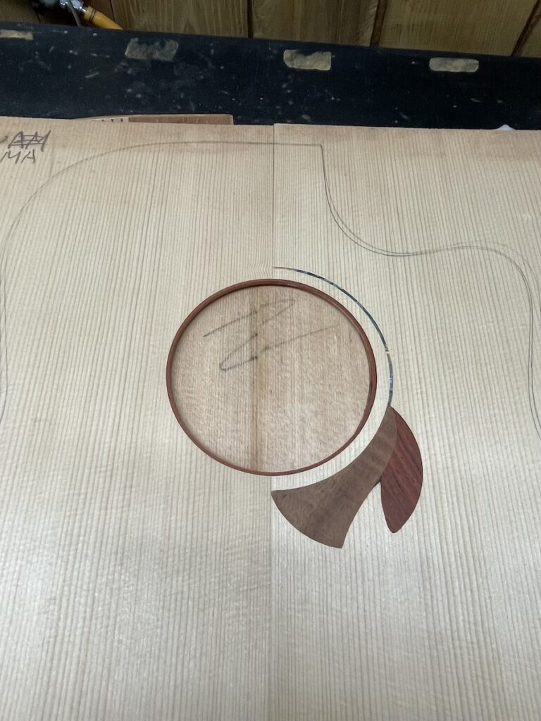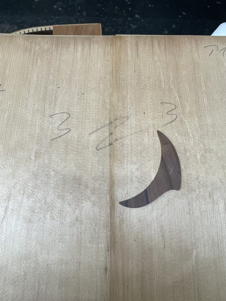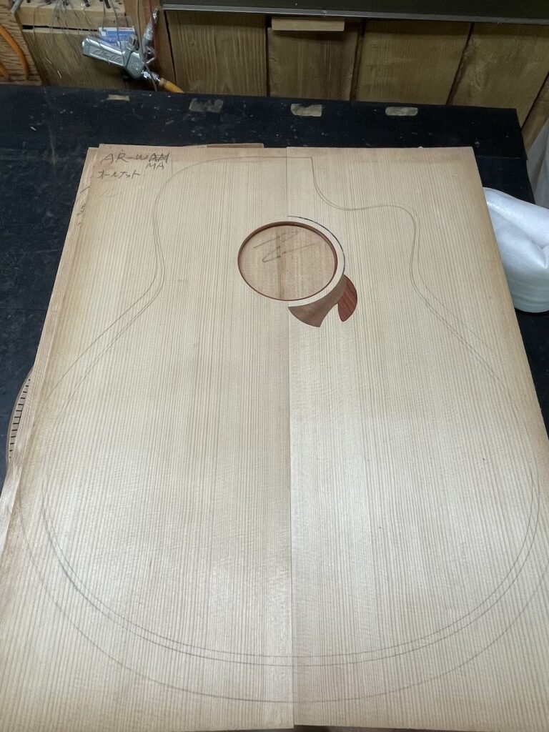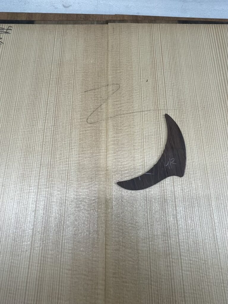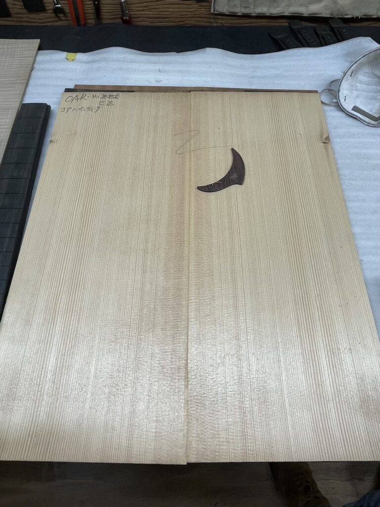 今回は贅沢に、きれいなベアクロウの入ったシトカスプルース、ホワイトスプルースをトップ材にチョイス。ホワイトスプルースの一枚は、以前短期間だけ製作していたロゼッタを施した表板を使用する事になりました。