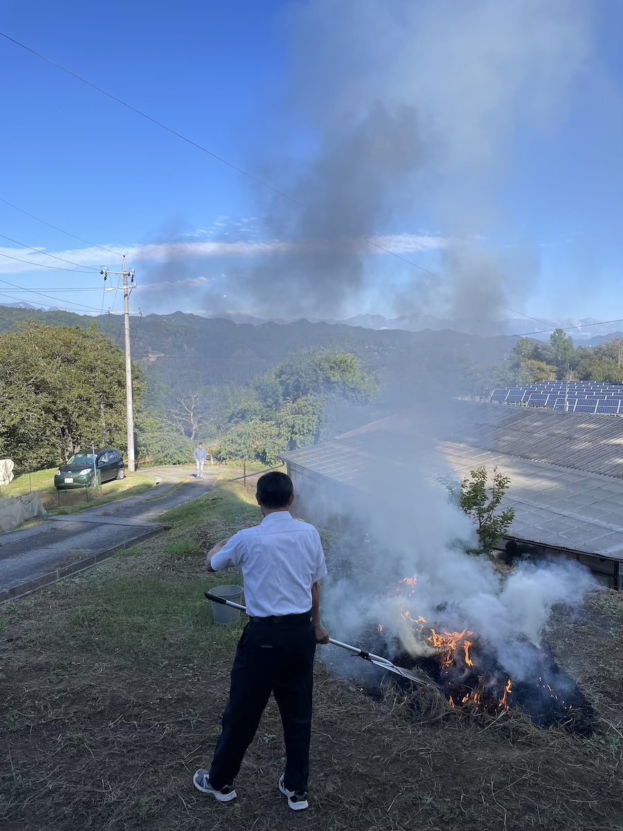 夏の終わりに伸びた草を刈り、まとめて大家さんに焼いてもらいます。この地域でも農業をされている方の特権です。