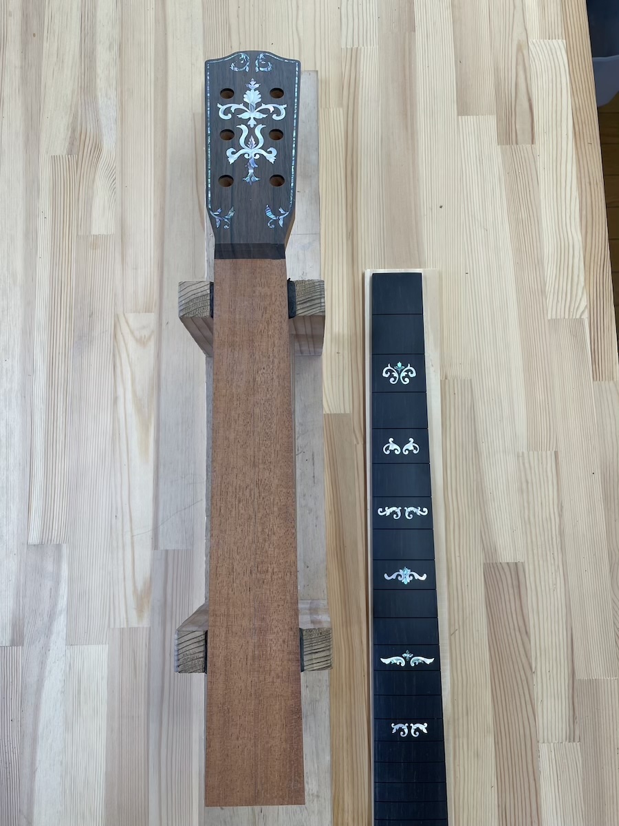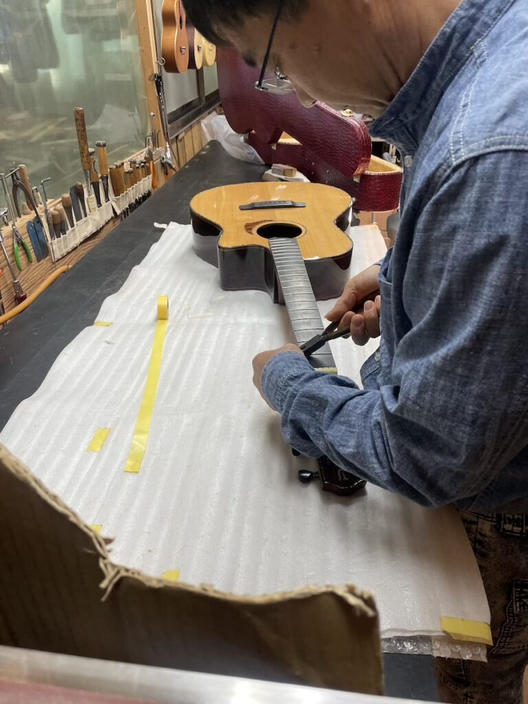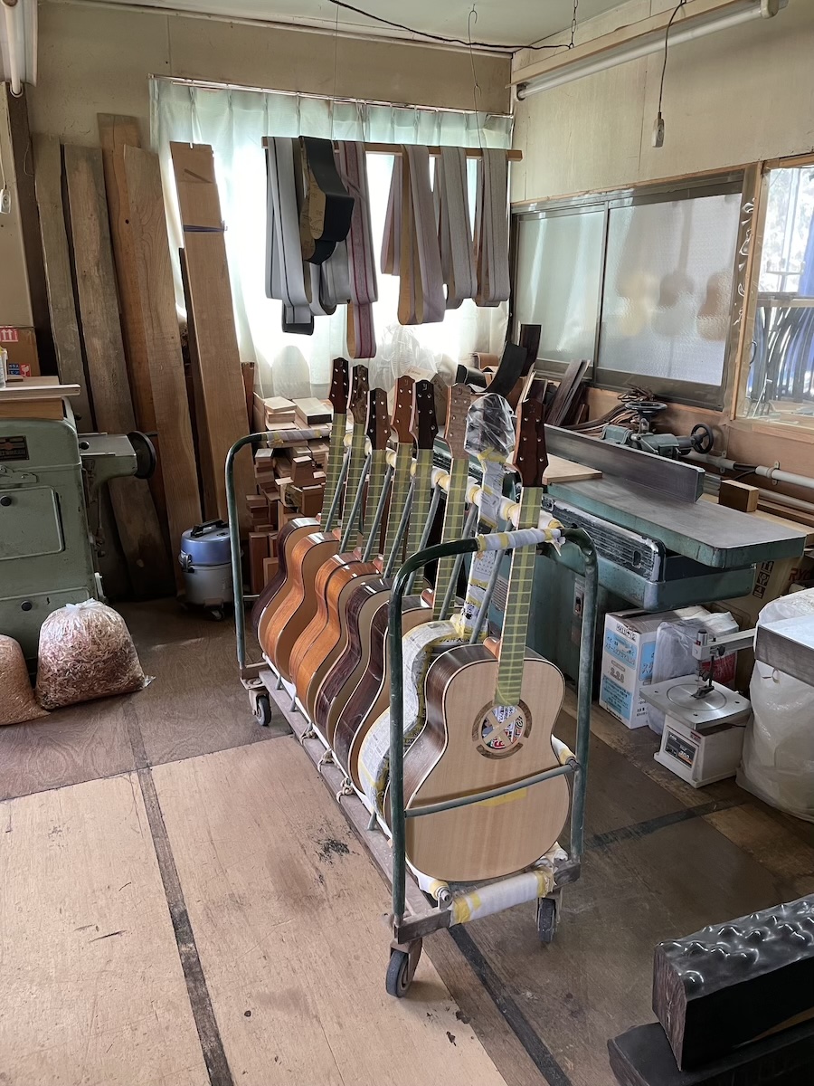 朝一で「秘密基地」周りの片付けを終わらせて、調整品等を確認します。指板にインレイご希望の個体はフレットを抜き去り、オガワインレイクラフトさんへの持ち込み準備をします。