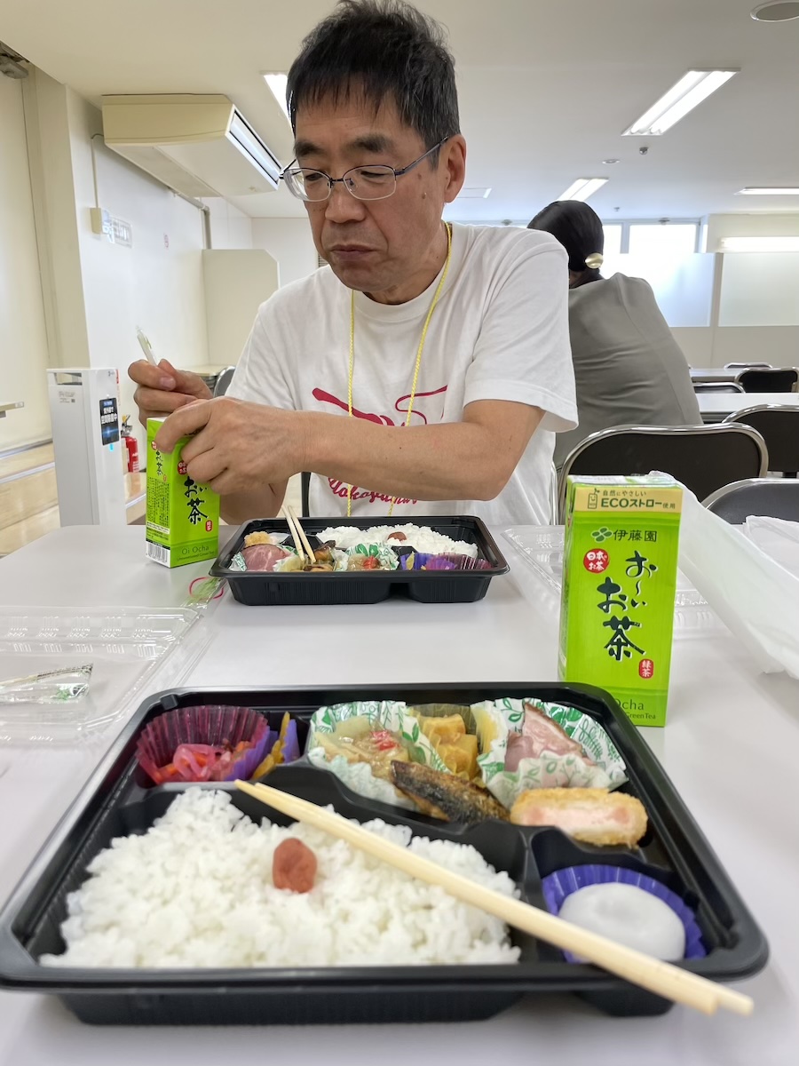 合間を見て、用意していただいた昼食のお弁当をいただき、ひと休み。やはり初日はお客様が多く、活気があります。