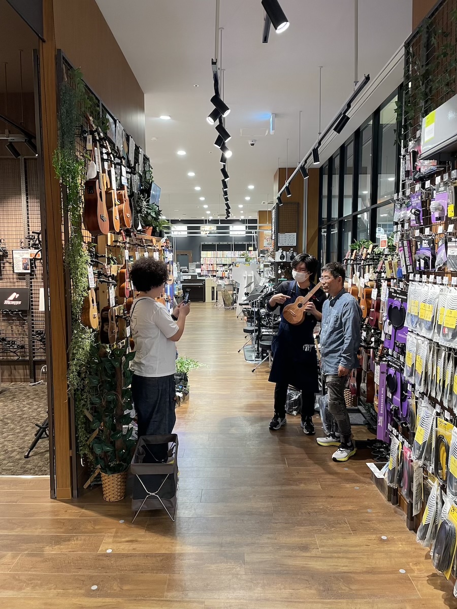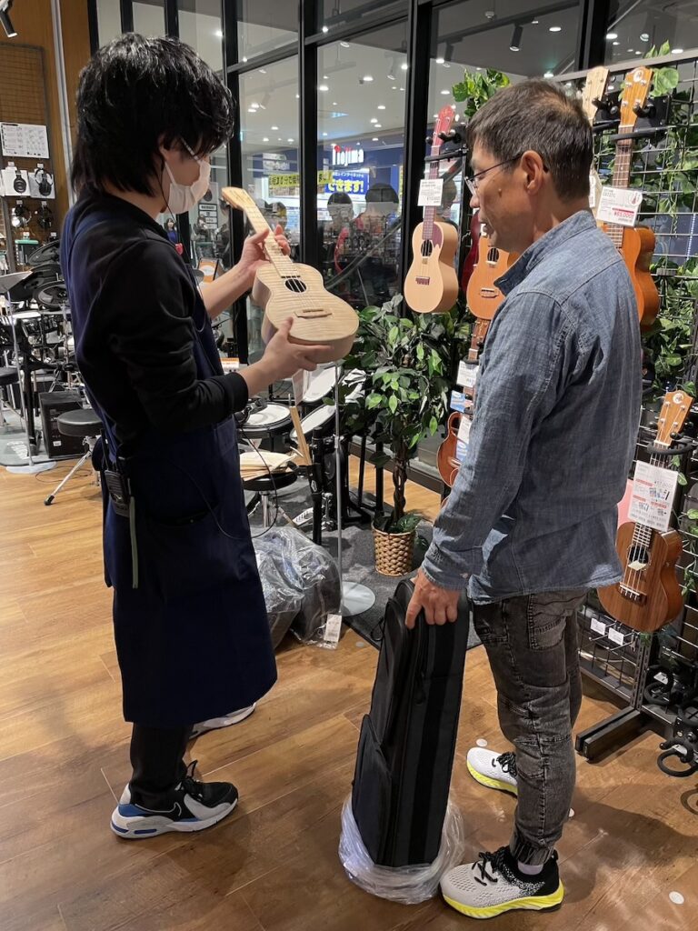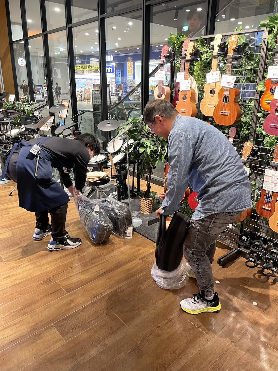 撤収作業を終えたら、展示していたウクレレを島村楽器 イオンモール松本店 沖田さんのところまでお届けです。