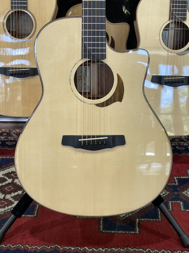 未だ根強く、アコースティックギター材として人気を持つインディアンローズウッドバック&サイドモデル。ローズウッドならではの深みのある中低域は、聴き慣れたトーンであり、落ち着くサウンドでもあります。ホワイトスプルースをトップに採用することで、コシがありつつも、マイルドさもあるサウンドに仕上がると思います。こちらも最新のエルボーコンターが施されます。(※セルバインディングの都合上深くは入りません。)