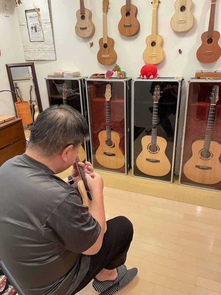 和材ウクレレの「栗」を気にされてご来店いただきましたが、色々とお試しいただくうちに他のモデルも気になってきてしまった様です。