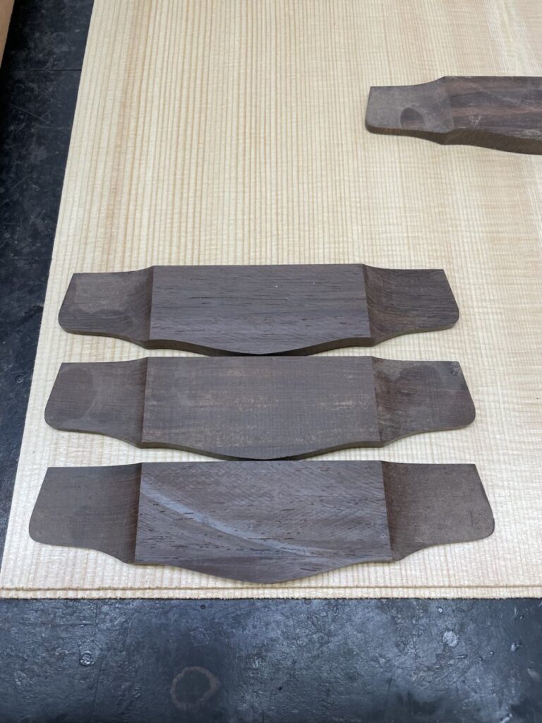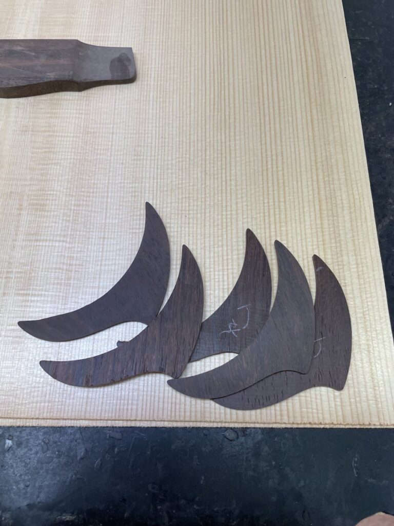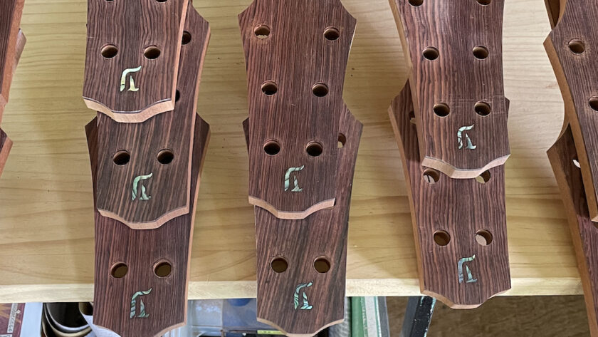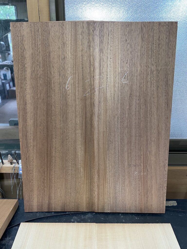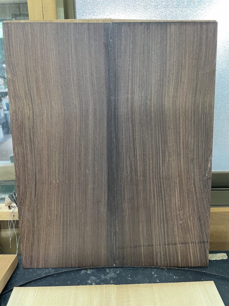 実は横山工房、かれこれ10年ぐらい前でしょうか。国内のとあるところから、大きなサイズのブラジリアンローズウッドを入手しています。かなり大きなブロックで、自身の工房に移動後、ボディや指板など、自分が使用するサイズに横山氏本人が捌いていました。こちらの材料はその一部なんですね。とても贅沢な材料を今回特別に使用しています。