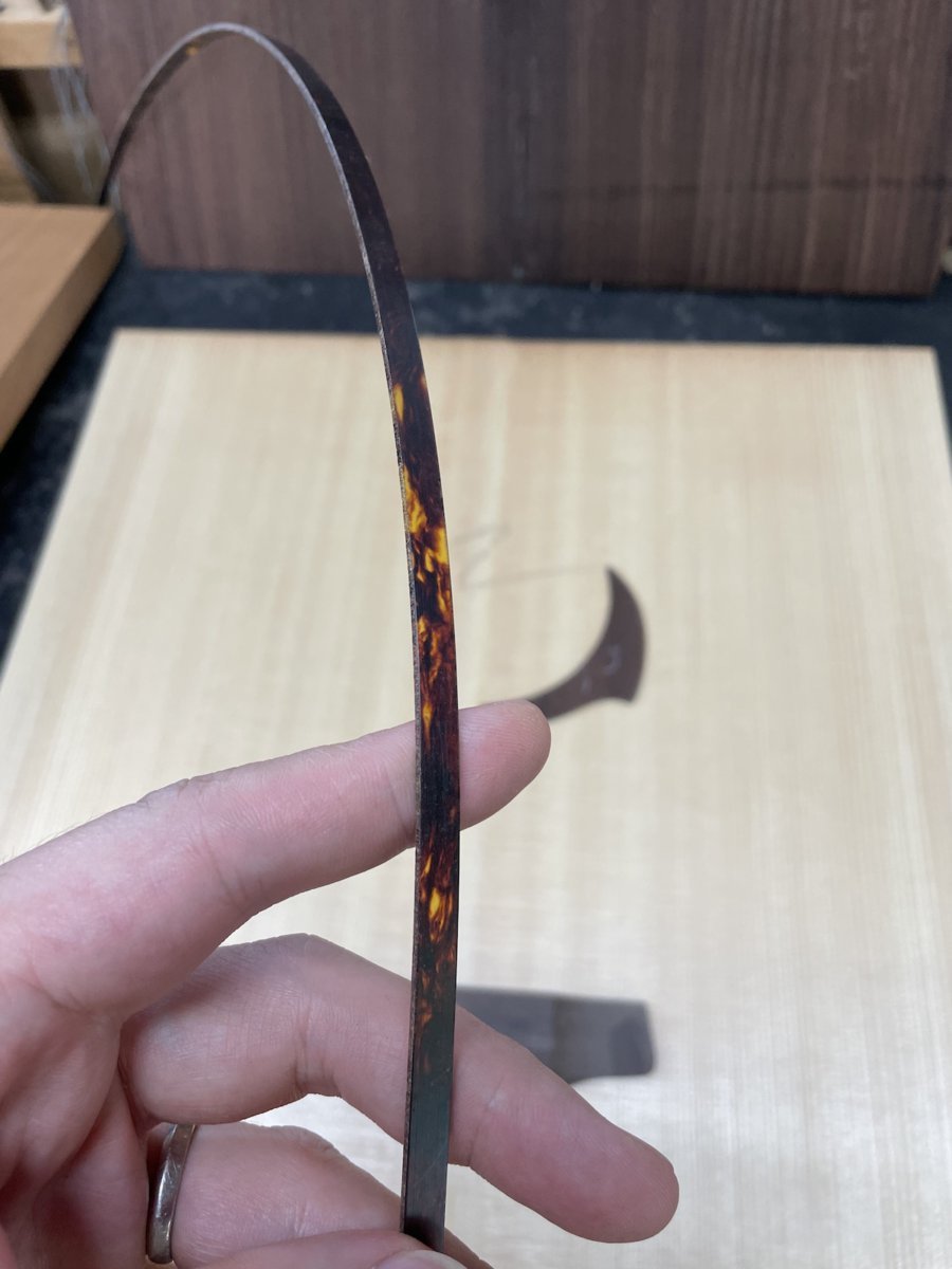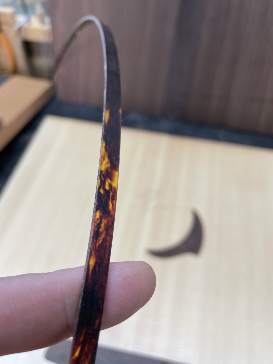 限定モデルらしく、少し雰囲気を変えたいという事で、工房でストックしていたべっ甲柄のバインディングを採用することになりました。これまでほとんどがウッドバインディングでしたので、これはとても新鮮だと思います。
