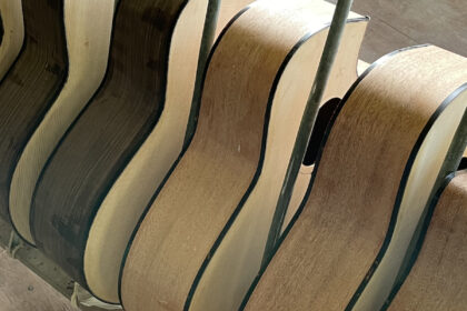 横山氏は、この限定モデルに最新のエルボーコンターも盛り込みたいらしいのですが、べっ甲柄のセル材の場合、ウッドバインディングほど深くコンターを入れることができないそうです。しかしながら、腕を乗せた時のストレスがないように、ハンドサンディングで丸めて仕上げるとの事でした。こちらは期待しましょう!