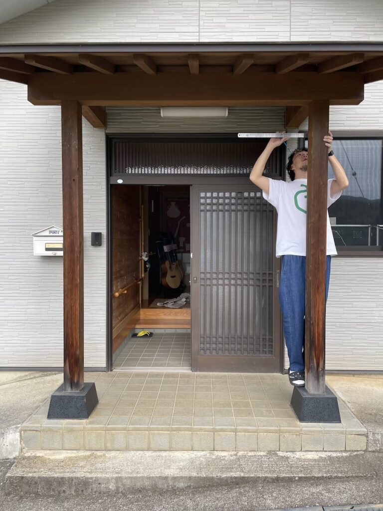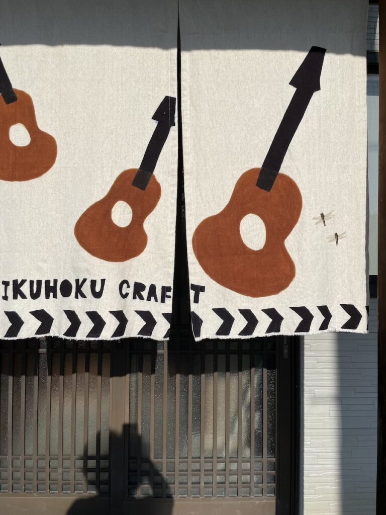 長野オフィス用に「染太郎」山岸さんにお願いしていた暖簾が完成し、ご本人にイベント前に届けていただいたので、早速オフィス入り口に設置します。(届けていただいた際の様子は、また後日ご紹介させていただきます。)