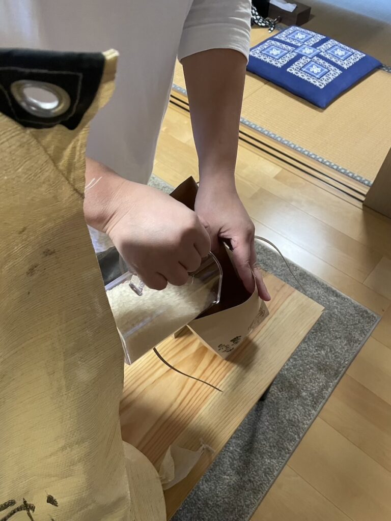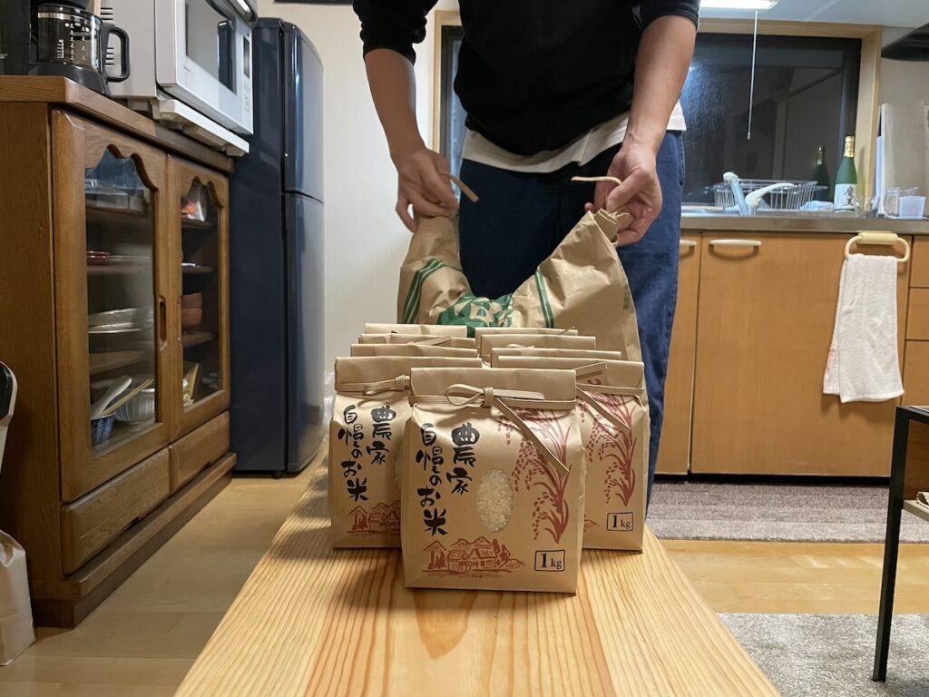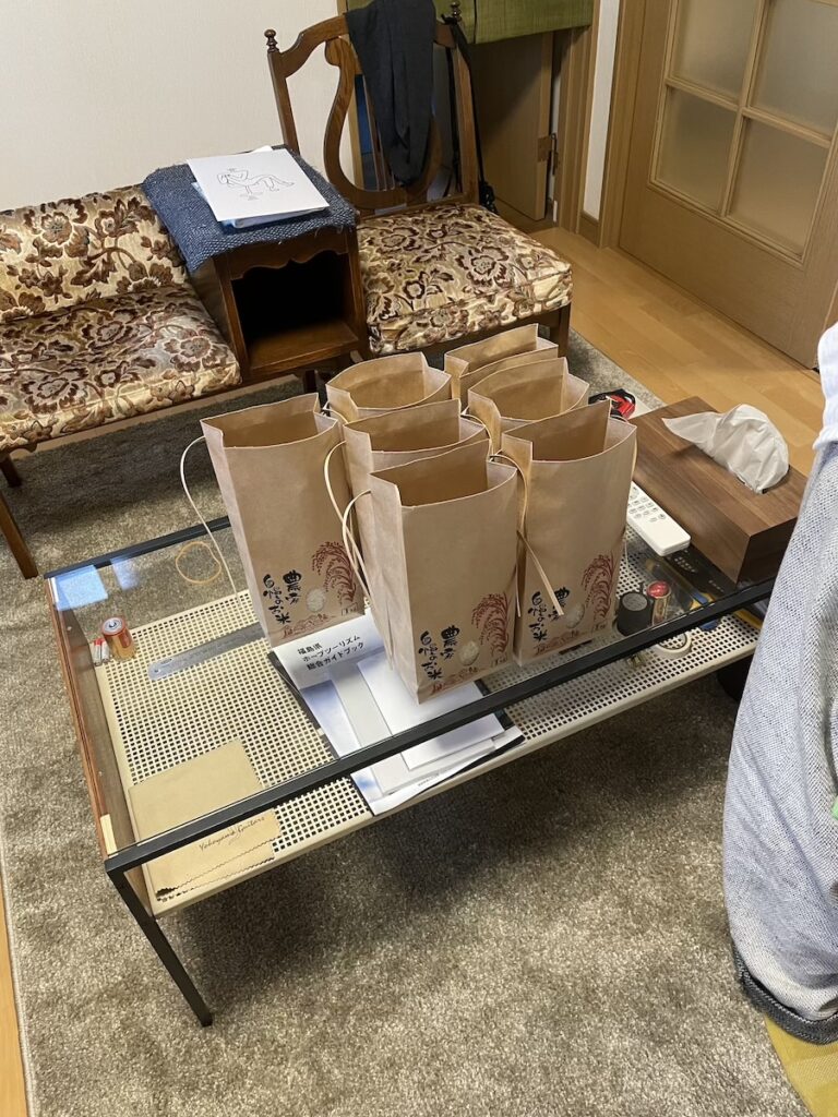 今回、ご来場いただいたお客様へのプレゼントとして、筑北村産の新米をご用意しました。味見程度ですが、1kg袋に詰めて準備します。このサイズ、とてもかわいいですね。