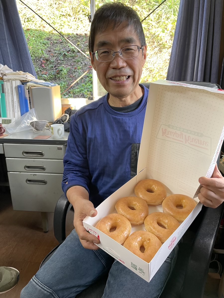 U様に差し入れでいただいたドーナツ。久しぶりなのでご満悦です。(表情で丸分かりですね。)