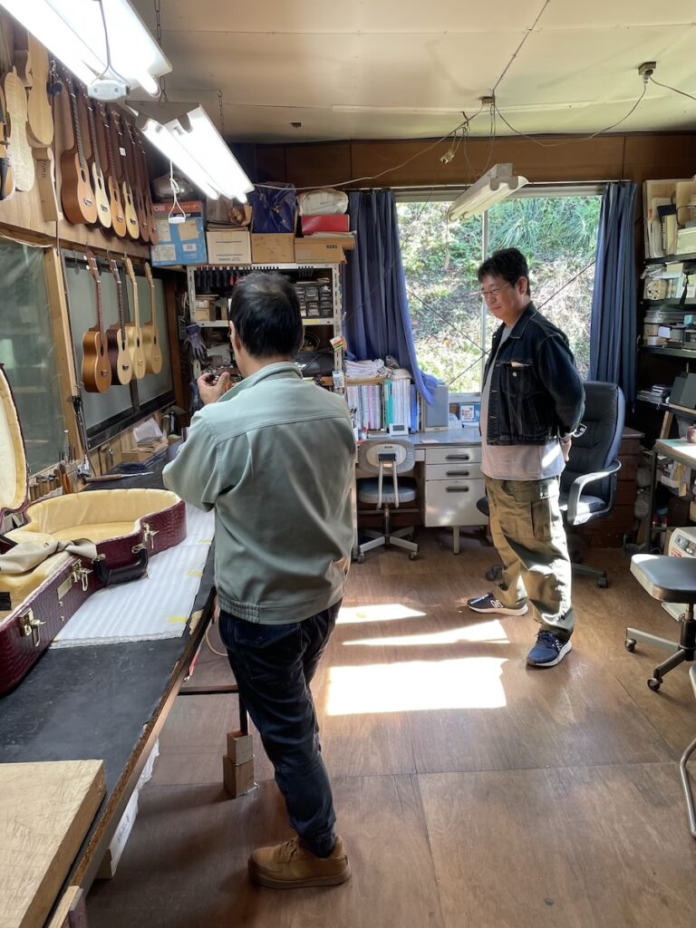 オフィス内の楽器を弾いていただいた後は、久しぶりに工房もご覧いただきます。