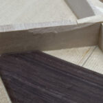 ピックガードの埋め込み材に使用したブラジリアンローズウッドもとても良い感じです。小さい材料ですが、やはり杢目に独特の雰囲気がありますね。