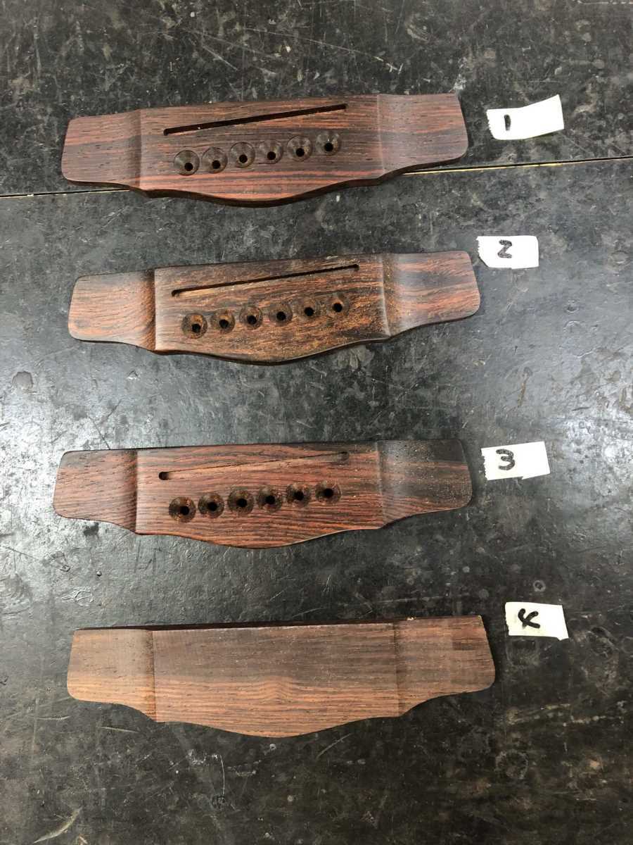 ブリッジ材も通常はエボニーですが、ブラジリアンローズウッドやマダガスカルローズウッドなどもございます。 ピンタイプのブリッジの他に、スルーブリッジもご用意があります。